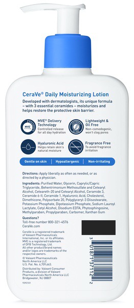 About This Item We aim to show you accurate product information. Manufacturers, suppliers and others provide what you see here, and we have not verified it. See our disclaimer Developed with dermatologists, CeraVe Daily Moisturizing Lotion for Normal to Dry Skin has a unique, lightweight formula that provides 24-hour hydration and helps restore the protective skin barrier with three essential ceramides (1,3,6-II). The formula also contains hyaluronic acid to help retain skin’s natural moisture. CeraVe Daily Moisturizing Lotion for Normal to Dry Skin: With ceramides 1, 3 and 6-II Hyaluronic acid to help retain skin's moisture Oil-free, Non-comedogenic Fragrance-free Gentle, non-irritating formula