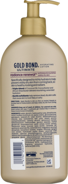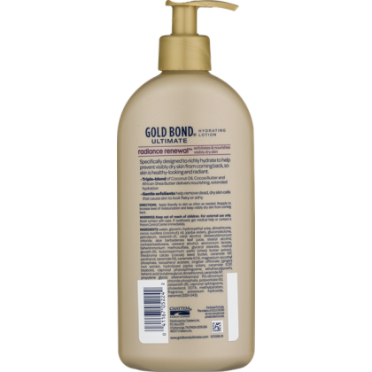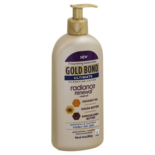 About This Item We aim to show you accurate product information. Manufacturers, suppliers and others provide what you see here, and we have not verified it. See our disclaimer GOLD BOND® Ultimate Radiance Renewal is a specially made cream oil blend that richly hydrates to help prevent visibly dry skin from coming back all day. GOLD BOND® Ultimate Radiance Renewal™ combines the ultimate triple-blend of Coconut Oil, Cocoa Butter and African Shea Butter to deliver nourishing, extended hydration. Coconuts yield a nourishing and moisturizing oil that contain high levels of naturally occurring fatty acids and proteins providing rich conditioning and skin soothing benefits. African Shea Butter has a high concentration of natural vitamins and fatty acids providing skin nourishing and smoothing benefits. Cocoa Butter is derived from cacao trees, and is rich in antioxidants and fatty acids which hydrate and nourish the skin. Gentle exfoliants help remove dead, dry skin cells that cause skin to look flaky or ashy. This lotion is dermatologist tested, non-greasy, and provides 24hr moisturization. GOLD BOND® Ultimate Radiance Renewal Lotion 14oz Specially made cream oil blend richly hydrates to help prevent visibly dry skin from coming back all day Exfoliates & nourishes visibly dry skin Combines 7 moisturizers with coconut oil, cocoa butter, & African shea butter Dermatologist tested Non-greasy 24hr moisturization