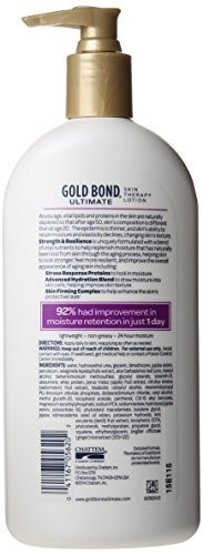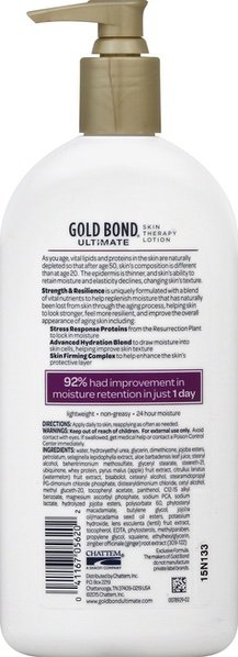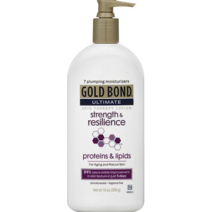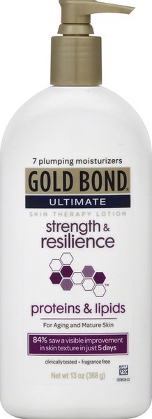 About This Item We aim to show you accurate product information. Manufacturers, suppliers and others provide what you see here, and we have not verified it. See our disclaimer GOLD BOND® Ultimate Strength & Resilience Lotion strengthens, increases resilience, and improves the texture of aging and mature skin. Over time, skin loses vital lipids and proteins, causing it to look old before its time, and the epidermis becomes thinner, hindering skin’s ability to retain moisture – leaving skin dry and dull looking. GOLD BOND® Ultimate Strength & Resilience is specially formulated for aging skin, with a blend of 7 plumping moisturizers and 3 vitamins with proteins and lipids to help replenish moisture that has been lost from skin through the aging process, helping skin look stronger and feel more resilient. This lotion is ideal for all over body use and is dermatologist tested, hypoallergenic, non-greasy, lightweight, fragrance free, and has 24 hour moisturization. GOLD BOND® Ultimate Strength & Resilience Lotion 13oz Strengthens, increases resilience, and improves the texture of aging and mature skin Specially formulated for aging skin Clinically tested, proven effective 84% saw a visible improvement in skin texture in just 5 days Contains 7 plumping moisturizers and 3 vitamins with proteins and lipids Dermatologist tested Hypoallergenic Non-greasy Fragrance Free 24hr moisturization