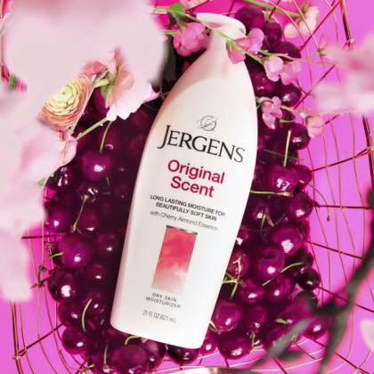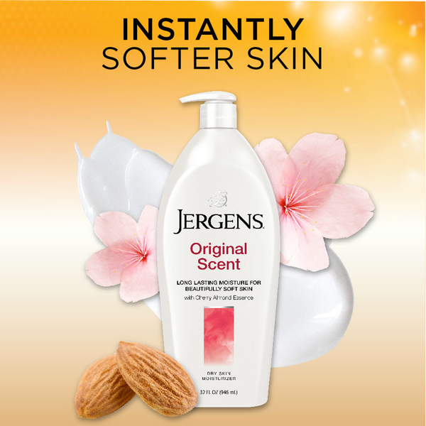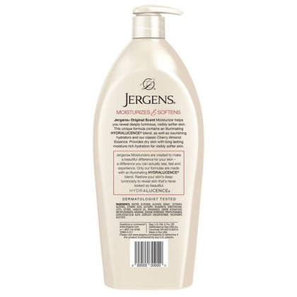 About This Item We aim to show you accurate product information. Manufacturers, suppliers and others provide what you see here, and we have not verified it. See our disclaimer Jergens® Orginal Scent Moisturizer helps you reveal deeply luminous, visibly softer skin. This unique formula contains an illuminating Hydralucence® blend, as well as nourishing hydrators and our classic Cherry Almond Essence. Provides dry skin with long lasting moisture rich hydration for visibly softer skin. Jergens® Moisturizers are created to make a beautiful difference for your skin—a difference you can actually see, feel and experience. Only our formulas are made with an illuminating Hydralucence® blend. Restore your skin's deep luminosity to reveal skin that's never looked so beautiful. Hydralucence®. Jergens® Original Scent Dry Skin Moisturizer. Long lasting moisture for beautifully soft skin with cherry almond essence. Moisturizes & softens. Jergens® original scent moisturizer helps you reveal deeply luminous, visibly softer skin. This unique formula contains an illuminating Hydralucence® blend, as well as nourishing hydrators and our classic cherry almond essence. Provides dry skin with long lasting moisture rich hydration for visibly softer skin. Jergens® moisturizers are created to make a beautiful difference for your skin - a difference you can actually see, feel and experience. Only our formulas are made with an illuminating Hydralucence® blend. Restore your skin's deep luminosity to reveal skin that's never looked so beautiful. Hydralucence®. Dermatologist tested. Questions or comments? www.jergens.com or 1-800-742-8798.Reg. U.S. Pat.4 Tm.Off.