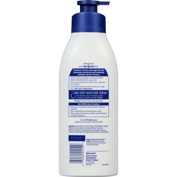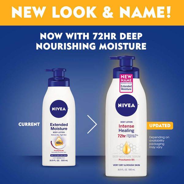 About This Item We aim to show you accurate product information. Manufacturers, suppliers and others provide what you see here, and we have not verified it. See our disclaimer Very dry, rough skin needs extra care, that’s why we have the NIVEA® Intense Healing Body Lotion (previously called Extended Moisture Body Lotion). The formula is enriched with our Deep Moisture Serum, and Provitamin B5 to deliver deep nourishing moisture that lasts for up to 72 hours. Don’t let dry skin win, Intense Healing is here to help. Formerly known as "NIVEA Extended Moisture Body Lotion". You may receive either product depending on availability. Moisturizes for up to 72 hours Nourishes, intensively moisturizes, and soothes dry rough skin, after just 1 application Locks in moisture & gives noticeably smoother skin Dermatologically tested and approved Non-greasy formula with ProVitamin B5 for very dry, rough skin Provides relief for dry, tight skin