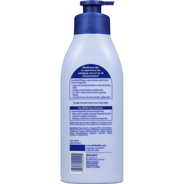 About This Item We aim to show you accurate product information. Manufacturers, suppliers and others provide what you see here, and we have not verified it. See our disclaimer NIVEA Body Lotion Infused with Vanilla Scent and Almond Oil transforms dry skin into smooth, radiant skin. The unique formula with gentle Vanilla scent blends natural Almond Oil with a fast absorbing lotion. Provides deep moisture for 24 hours with no greasy feeling. Packaging May Vary Gentle Vanilla scent. Transforms dry skin into smooth, radiant skin Provides deep moisture for 24 hours with no greasy feel Paraben free Dermatologically tested and approved