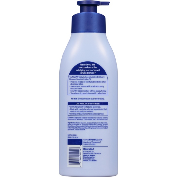 About This Item We aim to show you accurate product information. Manufacturers, suppliers and others provide what you see here, and we have not verified it. See our disclaimer NIVEA Body Lotion Infused with Vanilla Scent and Almond Oil transforms dry skin into smooth, radiant skin. The unique formula with gentle Vanilla scent blends natural Almond Oil with a fast absorbing lotion. Provides deep moisture for 24 hours with no greasy feeling. Packaging May Vary Gentle Vanilla scent. Transforms dry skin into smooth, radiant skin Provides deep moisture for 24 hours with no greasy feel Paraben free Dermatologically tested and approved