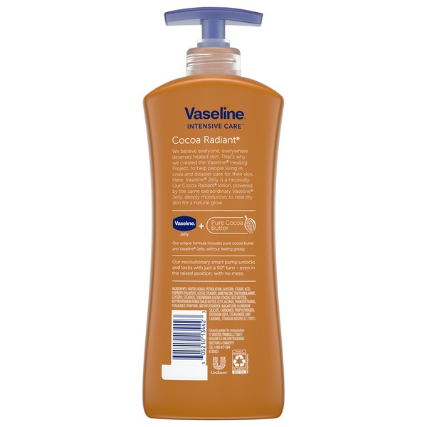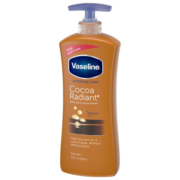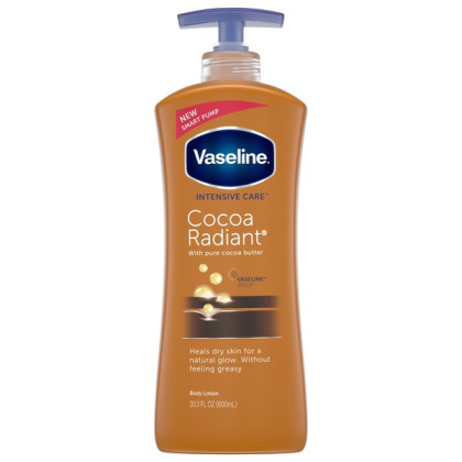 About This Item We aim to show you accurate product information. Manufacturers, suppliers and others provide what you see here, and we have not verified it. See our disclaimer Made with cocoa butter and a blend of Vaseline Jelly, Vaseline Intensive Care Cocoa Radiant Body Lotion helps keep your skin looking healthy and fresh. Our rich formula combines 100% pure cocoa and shea butters, giving you a natural glow. Clinically proven to keep skin healed for 3 weeks, after using daily for 4 weeks in a clinical study, this non-greasy, fast absorbing coca butter lotion is your go-to dry body moisturizer. Deep Moisturizing Daily Body Lotion Vaseline dry skin lotion goes beyond basic moisturization. Our Intensive Care range works to heal dry skin deep down. Vaseline Intensive Care Cocoa Butter Lotion contains healing micro-droplets of Vaseline Jelly that lock in moisture. Our moisturizing lotion restores the essential moisture your skin needs with a blend of nourishing ingredients and gives skin a natural, healthy glow. Body Moisturizer with Healing Micro-droplets of Jelly With daily exposure to environmental triggers, skin’s natural moisture barrier can break down, allowing for water to escape the skin. The healing micro-droplets of Vaseline Jelly in our lotion for dry skin locks in moisture to allow the skin’s natural barrier to recover. Smooth, hydrated skin can be yours with Vaseline Intensive Care Cocoa Radiant Lotion. Your skin won’t feel oily after using this body moisturizer – the non-greasy, fast absorbing formula moisturizes skin but leaves it feeling soft, not greasy. Vaseline Intensive Care Cocoa Radiant body Lotion is also infused with cocoa butter and has a pleasant, subtle fragrance. Vaseline Intensive Care Cocoa Radiant Body Lotion, 20.3 oz Vaseline Intensive Care Cocoa Radiant Body Lotion moisturizes dry skin Vaseline’s Cocoa Radiant Body Lotion is made with 100% pure cocoa and shea butters, known to reveal skin’s natural radiance Heals dry skin for glowing radiance with non-greasy, rich moisturization Contains pure cocoa butter to moisturize dry skin and promote a natural glow Contains microdroplets of Vaseline Jelly to lock in moisture Daily body lotion best for: dry skin, dull skin, rough skin