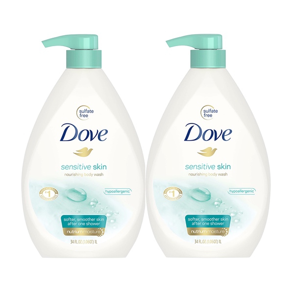 About This Item We aim to show you accurate product information. Manufacturers, suppliers and others provide what you see here, and we have not verified it. See our disclaimer Give your skin and body the tender loving care they need by showering with this Dove Sensitive Skin Body Wash Pump daily. This product is specially formulated with premium ingredients to moisturize your skin all day and leave a refreshingly sweet fragrance that lasts. This nourishing body wash wraps your body in a luxuriously rich lather. Its deep-conditioning formulation offers long-lasting moisture and soft and smooth skin. Lather it up with a puff and then rinse. This is sold as a pack of two 34-oz easy-dispense pump bottles. 2-Pack Dove Sensitive Skin Body Wash Pump, 34 oz: Nourish and clean your skin with this 2-pack of sulphate-free body wash 34 oz per bottle Luxuriously rich lather This Dove body wash is suited for sensitive skin Recommended for daily use Sweet and refreshing fragrance Lather it up with a puff and rinse