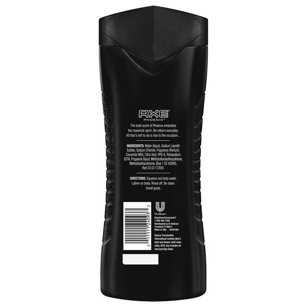 About This Item We aim to show you accurate product information. Manufacturers, suppliers and others provide what you see here, and we have not verified it. See our disclaimer AXE Phoenix 16oz Body Wash twin pack makes you feel clean, fresh, and rejuvenated. AXE Phoenix Body Wash for men has a classic, masculine, fruity fragrance that features lavender, geranium, and citrus. Named after the mythical bird that combusts only to be reborn from its ashes, AXE Phoenix Body Wash's earthy composition and subtle blend of wood and fruit let you be reborn every morning and night. To use, squeeze out the body wash into your palm and work into a foamy lather through your body. Rinse thoroughly and finish with your favorite AXE fragrance. To improve your shower experience, try the AXE Shower Detailer. Simply pour your AXE Phoenix Body Wash onto the AXE Detailer - a dual-sided shower tool that helps to both exfoliate and gently clean. The scrub side of the AXE Detailer removes dead skin and debris from rough spots like elbows and heels. Soft mesh on the flipside lathers to clean sensitive areas. Simply hang it to dry in the shower after getting clean. AXE Phoenix Body Wash is also available in Antiperspirant Stick, Daily Fragrance (previously known as body spray), Deodorant Stick, and Shampoo plus Conditioner for all of your grooming needs. AXE Phoenix Body Wash is also available in a 28 fl oz bottle with a convenient pump that dispenses the perfect amount of body wash every time. Find Your Magic with AXE – The No. 1 Male Body Wash Brand in the World. *Source: Euromonitor International Limited; Men's bath and shower retail value sales, 2015. Lynx includes all Axe/Lynx/Ego Sales AXE Phoenix Body Wash for Men, 16 oz, Twin Pack No. 1 Male Body Wash brand in the world (*Source: Euromonitor International Limited; Men' bath and shower retail value sales, 2015. Axe includes all AXE/Lynx/Ego Sales) Invigorating AXE Phoenix Body Wash in 16 fluid ounce bottle in a twin pack AXE Phoenix scent blends lavender, geranium, citrus, and coumarone, adding a crisp and earthy fragrance to your body soap This shower gel has a refreshing fragrance is the perfect way to kick off or end your day A men's body wash designed to leave you feeling refreshed and smelling good Try other refreshing AXE Men's Body Wash scents, including AXE Apollo Body Wash, AXE Dark Temptation Body Wash, and AXE Excite Body Wash
