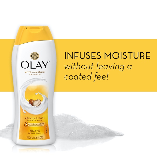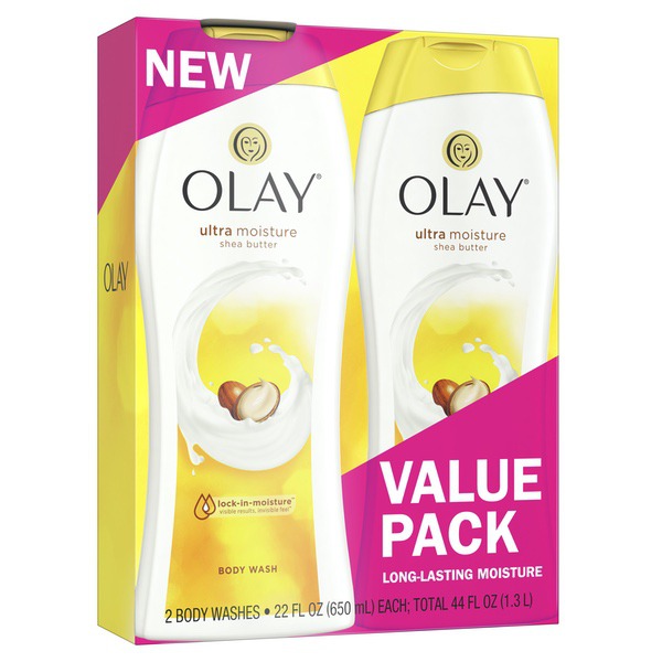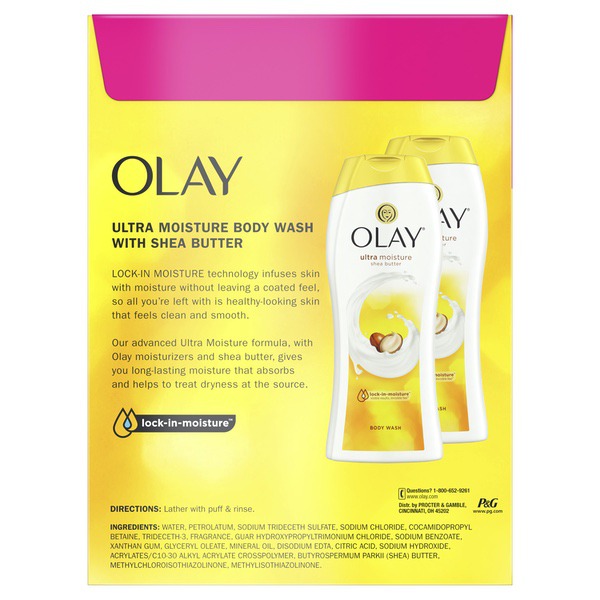 About This Item We aim to show you accurate product information. Manufacturers, suppliers and others provide what you see here, and we have not verified it. See our disclaimer Reveal beautiful, healthy-looking skin with Olay Ultra Moisture Shea Butter Body Wash. Its nourishing formula gently cleanses while delivering long-lasting moisture to help treat dryness at the source. With unique Lock-in-Moisture technology, this breakthrough body wash formula infuses moisture 10 layers deep into surface skin without leaving a coated feel. Its formula with shea butter leaves skin feeling soft and smooth, and reveals younger-looking skin with continued use. Give your shower a simple solution that deeply moisturizes to nourish and purify skin when you cleanse from head to toe. Olay Ultra Moisture Shea Butter Body Wash, 2x22 oz (Twin Pack)
