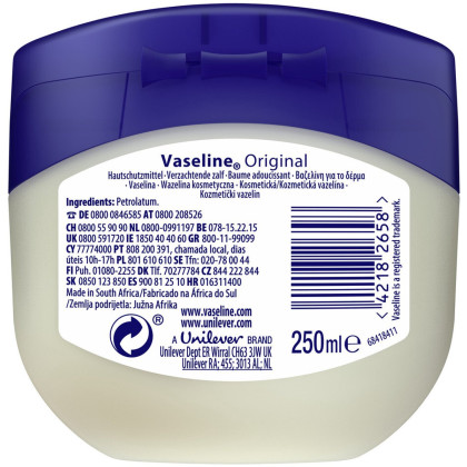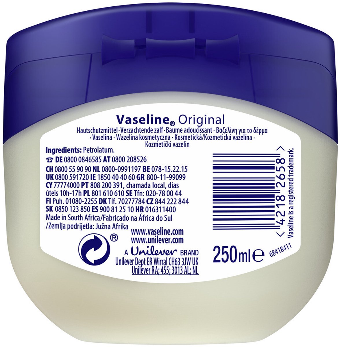 Waarom Vaseline Original onmisbaar is in jouw badkamer: ???? Diep Herstel: Sluit essentieel vocht in en versnelt het natuurlijke herstelproces van de huid. ????️ Ultieme Bescherming: Vormt een onzichtbare barrière tegen regen, wind en kou. ✨ Multifunctioneel Wonder: Ideaal voor droge lippen, ruwe handen, kapotte hielen en zelfs als highlighter voor je make-up! pocket-size:** Het handzame potje neem je overal mee naartoe. Altijd en overal verzorging bij de hand.