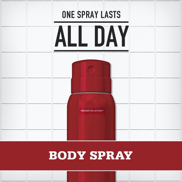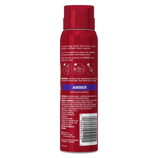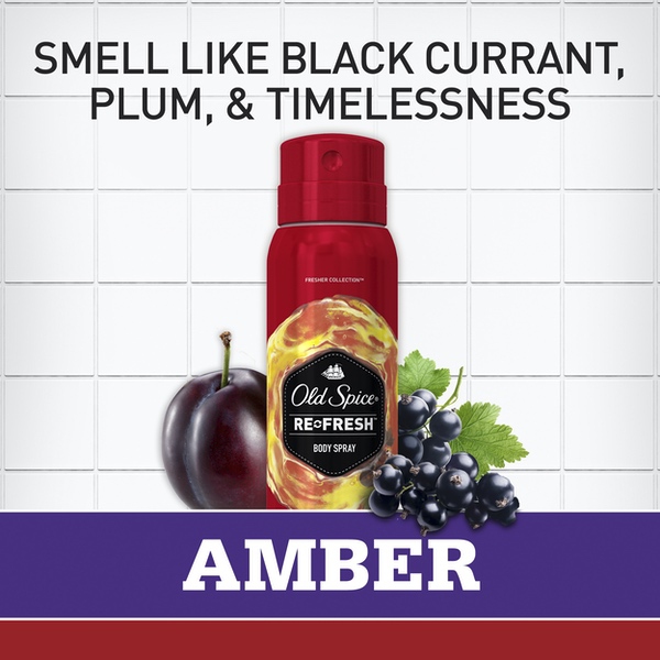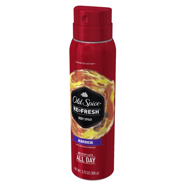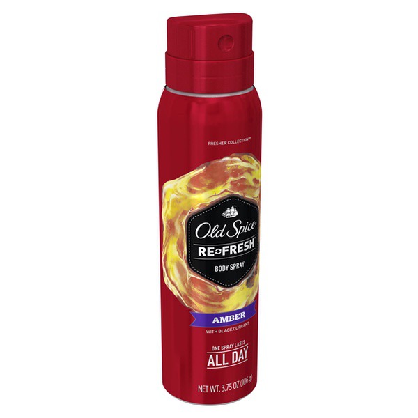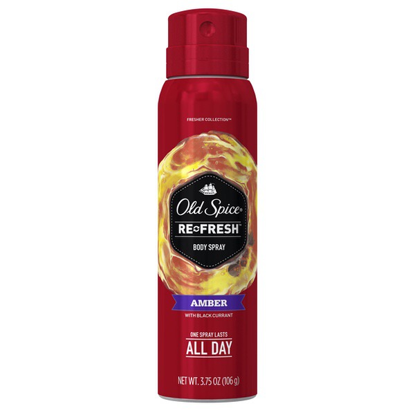 About This Item We aim to show you accurate product information. Manufacturers, suppliers and others provide what you see here, and we have not verified it. See our disclaimer Old Spice Men's Body Spray keeps you smelling great all day. Simply unlock the cap and spray your body from 6-8 inches away before you leave the house in the morning. Keep one in your gym bag and one at home. Climb the tallest tree. Sail the widest ocean. Discover the heretofore undiscoverable. Why? Smellventure, my friend, smellventure. Bring the aromas of your far-off conquests home and then slather them all over your body. Amber scent captures a singular moment in the history of good-smellingness. This particular moment smells like blackberry, plum and amber. Old Spice Men's Body Spray keeps your whole body smelling fresh all day long with Re-fresh Scent Technology because that's how long you have a body. So cast your eyes towards the horizon, and then go get it and bring it back here so we can see what it looks like. Old Spice Fresher Amber Scent Body Spray for Men, 3.75 oz: Preserve your freshness in Amber, a blackberry, vanilla, and amber scent Old Spice Men's Body Spray for bodies lasts all day, because your body is your body all day long - usually Fresher Collection smells as great as nature is, taking inspiration from the freshest places in the world So easy to use you might accidentally put it on and only later realize your man-nificence Wearing body spray is like wearing a suit of armor except the suit is a smell and won't stop projectiles so don't expect it to Old Spice Fresher Collection Amber Scent Men's Body Wash