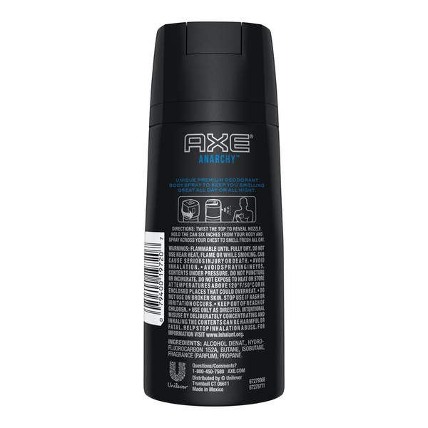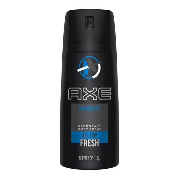About This Item We aim to show you accurate product information. Manufacturers, suppliers and others provide what you see here, and we have not verified it. See our disclaimer AXE Body Spray for Men Anarchy For Him 4 oz is part of the Anarchy For Him male grooming range from AXE. It is a rich, spicy fragrance that combines fresh and fruity notes. Sweet sandalwood and white amber leave you feeling refreshed. A few quick sprays of AXE Body Spray for men Anarchy For Him 4 oz is all you need. This unique premium deodorant body spray will keep you smelling great all day or all night. First twist the cap and then target your body and neck for a great smelling fragrance that makes a lasting impression. Boost your sweat and odor protection with AXE Antiperspirant Deodorant Stick for men 2.7 oz, get clean and fresh with AXE Body Wash for men 16 fl. Oz, and complete the range with AXE 2-in-1 Shampoo and Conditioner 12 fl oz â all available in Anarchy For Him. An AXE Deodorant Stick for Men 3 oz is also available in Anarchy For Him. And check out our other AXE body spray for men scents, like Phoenix, Essence, Dark Temptation, and Apollo. FIND YOUR MAGIC with AXE Body Spray for men Anarchy For Him 4 oz from AXE Grooming For Men. Wondering why the can says AXE Daily Fragrance? AXE Body Spray for men is now known as AXE Daily Fragrance. The same great scents that you know and love, now with fresh redesigned packaging. AXE Anarchy Body Spray for Men, 4 oz AXE Body Spray for Men, Anarchy, 4 oz – A rich, spicy fragrance that combines fresh and fruity notes Sweet sandalwood and white amber leave you feeling refreshed A unique fragrance in a 4 oz can A few sprays is all you need Use AXE anytime, smell great all the time Goes well with AXE Anarchy For Him Body Wash 16 fl oz, AXE Anarchy For Him Antiperspirant Deodorant stick 2.7 oz, and AXE Anarchy For Him 2-in-1 Shampoo+Conditioner 12 fl oz