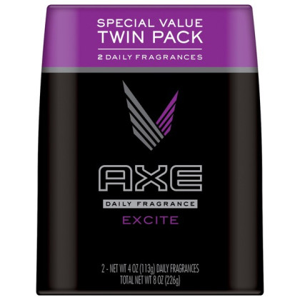About This Item We aim to show you accurate product information. Manufacturers, suppliers and others provide what you see here, and we have not verified it. See our disclaimer AXE Body Spray for Men Excite 4 oz Twin Pack is part of the Excite male grooming range from AXE. It is a woody fragrance with a hint of sweetness. A blend of coconut, hazelnut and caramel notes leaves you feeling refreshed. A few quick sprays of AXE Body Spray for men Excite 4 oz is all you need. First twist the cap and then target your body and neck for a lasting great smelling fragrance that makes a lasting impression. Boost your sweat and odor protection with AXE Antiperspirant Deodorant Stick for men 2.7 oz and get clean and fresh with AXE Body Wash for men 16 fl. Oz – both available in Excite. Complete the range with AXE Anti-Dandruff 2-in-1 Shampoo and Conditioner 12 fl oz. An AXE Deodorant Stick for Men 3 oz is also available in Excite. AXE Body Spray for Men Excite in a Twin Pack so you can have one at home and one on the go. And check out our other AXE body spray for men scents, like Phoenix, Essence, Dark Temptation, and Apollo. FIND YOUR MAGIC with AXE Body Spray for men Excite 4 oz from AXE Grooming For Men. Wondering why the can says AXE Daily Fragrance? AXE Body Spray for men is now known as AXE Daily Fragrance. The same great scents that you know and love, now with fresh redesigned packaging. AXE Excite Body Spray for Men: AXE Body Spray for Men, Excite, 4 oz Twin Pack - A woody fragrance with a hint of sweetness A blend of coconut, hazelnut and caramel notes A unique fragrance in a 4 oz can A few sprays is all you need Use AXE anytime, smell great all the time Goes well with AXE Excite Body Wash 16 fl oz, AXE Excite Antiperspirant Deodorant stick 2.7 oz, and AXE Anti-Dandruff 2-in-1 Shampoo+Conditioner 12 fl oz