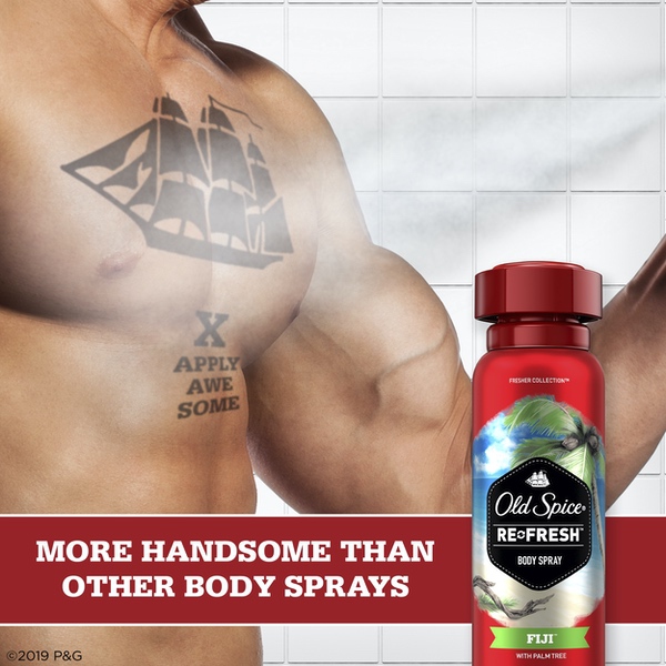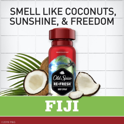 About This Item We aim to show you accurate product information. Manufacturers, suppliers and others provide what you see here, and we have not verified it. See our disclaimer Old Spice Men's Body Spray keeps you smelling great all day. Simply unlock the cap and spray your body from 6-8 inches away before you leave the house in the morning. Keep one in your gym bag and one at home. Climb the tallest tree. Sail the widest ocean. Discover the heretofore undiscoverable. Why? Smellventure, my friend, smellventure. Bring the aromas of your far-off conquests home and then slather them all over your body. Fiji has the fresh coconut and tropical wood scents of a relaxing, half-remembered dream that you later remembered and then willed into reality. Old Spice Men's Body Spray keeps your whole body smelling fresh all day long with Re-fresh Scent Technology because that's how long you have a body. So cast your eyes towards the horizon, and then go get it and bring it back here so we can see what it looks like. Old Spice Fresher Fiji Scent Body Spray for Men, 3.75 oz: Who needs a boat? You can swim there! Fiji smells like coconut, tropical wood, and freedom Old Spice Men's Body Spray for bodies lasts all day, because your body is your body all day long - usually Fresher Collection smells as great as nature is, taking inspiration from the freshest places in the world So easy to use you might accidentally put it on and only later realize your man-nificence Wearing body spray is like wearing a suit of armor except the suit is a smell and won't stop projectiles so don't expect it to Old Spice Fresher Collection Fiji Scent Men's Body Spray
