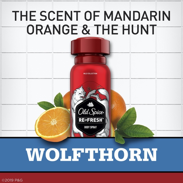 About This Item We aim to show you accurate product information. Manufacturers, suppliers and others provide what you see here, and we have not verified it. See our disclaimer Old Spice Men's Body Spray keeps you smelling great all day. Simply unlock the cap and spray your body from 6-8 inches away before you leave the house in the morning. Keep one in your gym bag and one at home. Deep in every man, beneath the people clothes and remembering how to drive, beats the heart of a wild animal. Old Spice Wild Collection taps into that animal magnetism and unleashes the power of a beast in his element. Wolfthorn smells like the seductive and mysterious night. Old Spice Men's Body Spray keeps your whole body smelling fresh all day long with Re-fresh Scent Technology because that's how long you have a body. Win the battle of natural selection: out-compete your enemies, attract nearby females, and answer the smell of the wild. Old Spice Wild Wolfthorn Scent Body Spray for Men, 3.75 oz: Wolfthorn is the sort of sophisticated wolf who wears a suit that has a suave, sweet orange scent Old Spice Men's Body Spray for bodies lasts all day, because your body is your body all day long - usually Answer the smell of the wild with Old Spice Wild Collection So easy to use you might accidentally put it on and only later realize your man-nificence Wearing body spray is like wearing a suit of armor except the suit is a smell and won't stop projectiles so don't expect it to