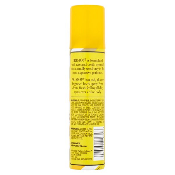 About This Item We aim to show you accurate product information. Manufacturers, suppliers and others provide what you see here, and we have not verified it. See our disclaimer Rise to the top with Primo! a musky fragrance that evokes power and grace with its strong floral notes and long-lasting luxurious scent. This brilliant brainchild from PDC Brands is from the bran s Designer Imposters line of body sprays and perfumes. Designer quality fragrances, not designer prices These top quality fragrances are formulated with the rare and costly essences normally used only in the most expensive perfumes.