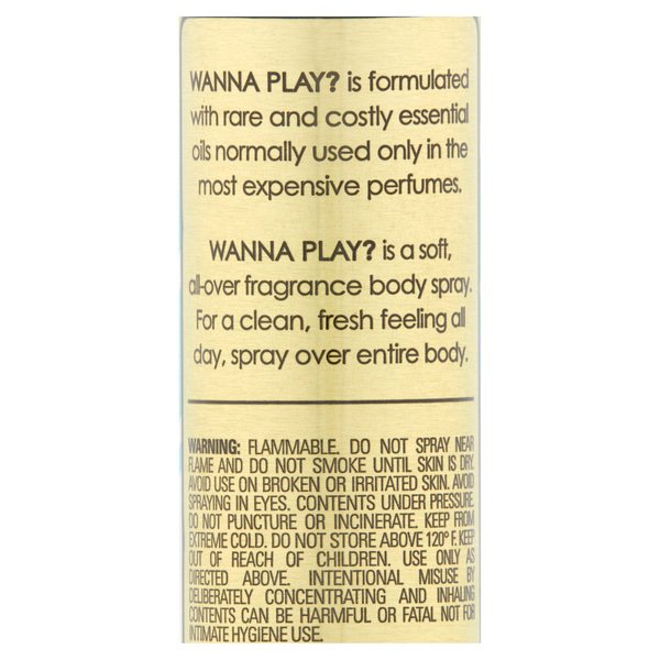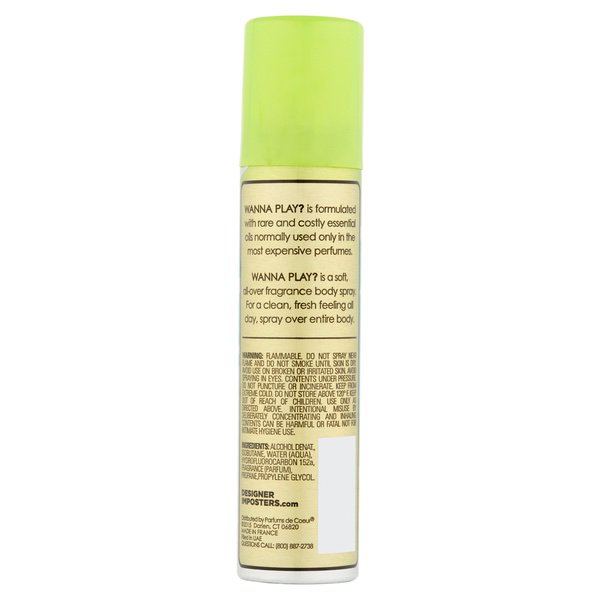 About This Item We aim to show you accurate product information. Manufacturers, suppliers and others provide what you see here, and we have not verified it. See our disclaimer Designer Imposters Wanna Play? Body Spray is formulated with rare and costly essences normally used only in the most expensive perfumes. Wanna Play? is a soft, all-over body fragrance and a gentle effective deodorant. For a delightfully clean, fresh feminine feeling all day, spray over entire body A soft, all-over body fragrance and a gentle effective deodorant.