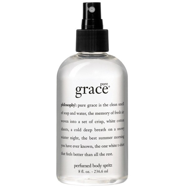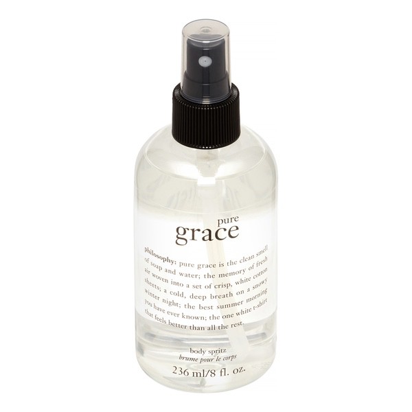 About This Item We aim to show you accurate product information. Manufacturers, suppliers and others provide what you see here, and we have not verified it. See our disclaimer Start each day fresh with the clean, soap-and-water fragrance of Philosophy Pure Grace Body Spritz. The subtle scents of water lilies and leafy greens provide a light, uncomplicated base for this whole-body spritzer. Along with light floral extracts, this airy body spritz also includes panthenol to help moisturize. Use it alone or layer with other fragrances for an uplifting scent to take you through the day. Philosophy Pure Grace Body Spritz 8 Oz