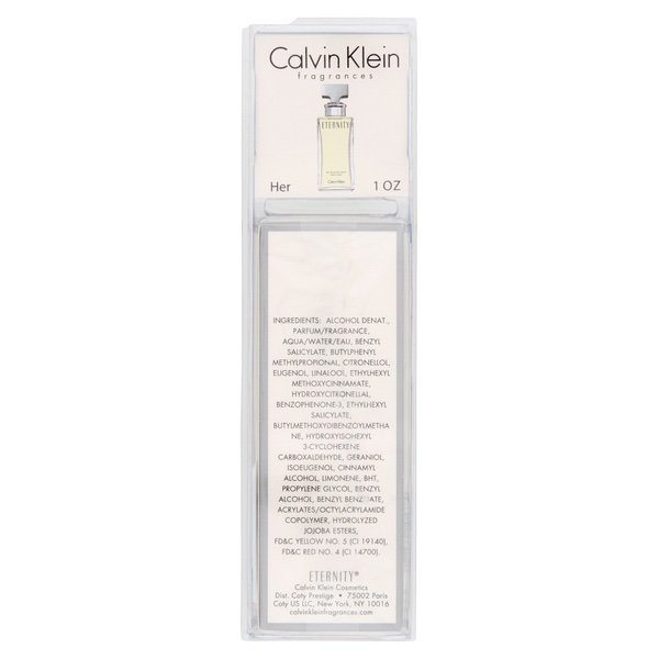 About This Item We aim to show you accurate product information. Manufacturers, suppliers and others provide what you see here, and we have not verified it. See our disclaimer From calvin klein comes eternity, a romantic, floral scent that breathes with the subtle aroma of a spring garden. Both classic and contemporary, it echoes timeless quality and modern style. Calvin Klein ETERNITY Eau De Parfum Spray for Women 1 oz