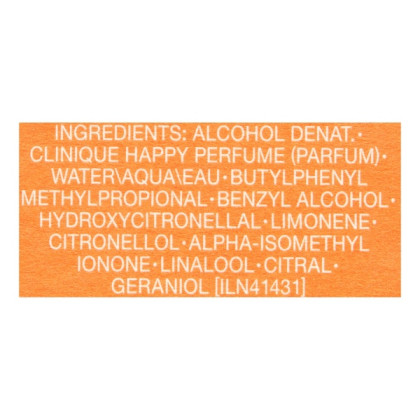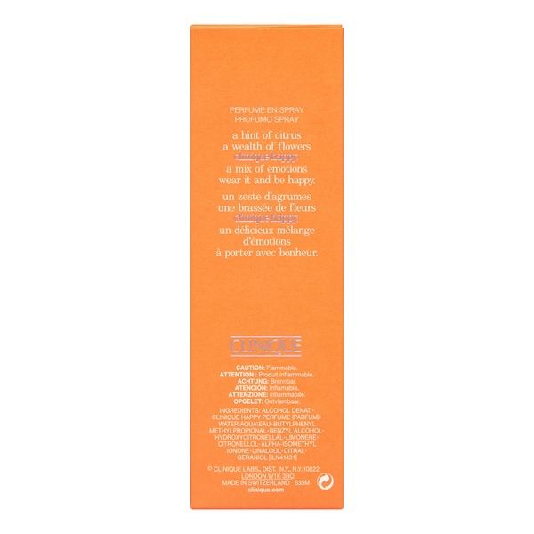 About This Item We aim to show you accurate product information. Manufacturers, suppliers and others provide what you see here, and we have not verified it. See our disclaimer Clinique Happy Perfume Spray for Women, 3.4 Oz Happy by Clinique is a feminine scent that exudes happiness and joy. This fragrance, which is reminiscent to a sunny day, is ideal for daytime wear. Clinique Happy is a fragrance of joy, the essence of a sunny, happy morning. Wear Happy and be happy! Fresh apple, plums and bergamot mixed with the fresh-air accord as top notes proceed into the egzotic floral heart composed of freesia, lily, rose and morning orchid. Musk and amber are in perfumeâs base. It was created in 1998. Happy was created by Jean Claude Delville and Rodrigo Flores-Roux. Happy By Clinique Perfume Spray 3.4 Oz (W)