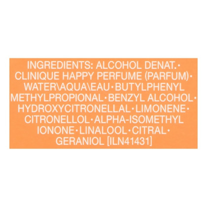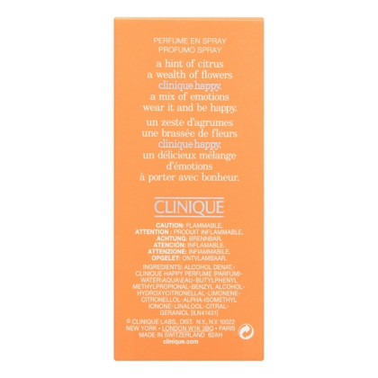 About This Item We aim to show you accurate product information. Manufacturers, suppliers and others provide what you see here, and we have not verified it. See our disclaimer Clinique Happy Perfume Spray for Women, 3.4 Oz Happy by Clinique is a feminine scent that exudes happiness and joy. This fragrance, which is reminiscent to a sunny day, is ideal for daytime wear. Clinique Happy is a fragrance of joy, the essence of a sunny, happy morning. Wear Happy and be happy! Fresh apple, plums and bergamot mixed with the fresh-air accord as top notes proceed into the egzotic floral heart composed of freesia, lily, rose and morning orchid. Musk and amber are in perfumeâs base. It was created in 1998. Happy was created by Jean Claude Delville and Rodrigo Flores-Roux. Happy By Clinique Perfume Spray 3.4 Oz (W)