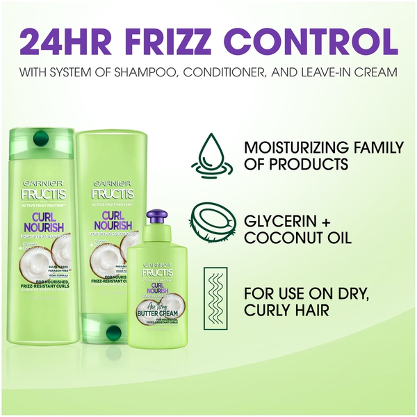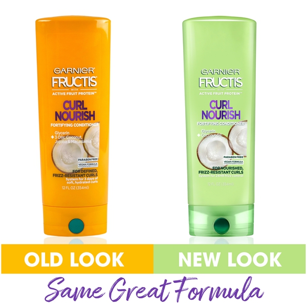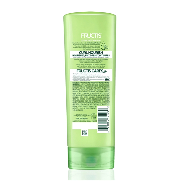 About This Item We aim to show you accurate product information. Manufacturers, suppliers and others provide what you see here, and we have not verified it. See our disclaimer Hair is almost entirely made up of protein, which gives hair its strength. ALL NEW, paraben-free Fructis formulas with Active Fruit Protein, an exclusive combination of citrus protein, Vitamins B3 & B6, fruit & plant-derived extracts and strengthening conditioners, are designed for healthier, stronger hair. The conditioner in our sulfate-free Fructis Triple Nutrition Curl Nourish system, with Coconut, Jojoba and Macadamia Oils, provides a gentle cleanse and intense nourishment for stronger hair with well defined, smoother, frizz-resistant curls. Garnier Fructis Curl Nourish Conditioner provides intense nourishment for curly hair Give your curls 24 Hour Frizz Control with the Garnier Fructis Curl Nourish System of products Infused with with Glyercin and Coconut Oil, no parabens Packaging may vary - new look, same amazing formula
