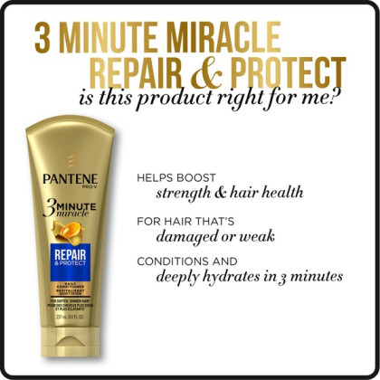 About This Item We aim to show you accurate product information. Manufacturers, suppliers and others provide what you see here, and we have not verified it. See our disclaimer Don't let damaged hair get you down. Pantene Repair & Protect 3 Minute Miracle Daily Conditioner helps super-charge your routine for super-strong (strength against damage) results. Ideal for damaged or weak hair, it transforms your strands to help make weak hair healthy and strong against damage. Simply leave on hair for 3 minutes, then rinse and feel the difference. For best results, use with Pantene Repair & Protect collection. Pantene Repair & Protect 3 Minute Miracle Daily Conditioner, 8.0 fl oz: Pantene Repair & Protect 3 Minute Miracle Daily Conditioner is our gold standard in repairing & protecting Powerful conditioning formula helps super-charge your routine Miracle conditioning for damaged or weak hair helps make hair healthy and strong against damage Can be used daily, depending on your hair needs Apply starting at tips and work toward roots, leave on for 3 minutes, rinse