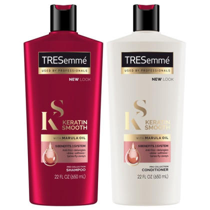 About This Item We aim to show you accurate product information. Manufacturers, suppliers and others provide what you see here, and we have not verified it. See our disclaimer Let’s give it to you straight. Our redesigned formula with luxurious Marula oil delivers not one, but five smoothing benefits so you can forget the frizz and indulge in gorgeously silky hair for up to 72 hours.* Don’t let unruly frizz ruin your style. When it comes to control, you should never have to compromise smooth for limp, poker straight hair. Specially formulated to fight frizz, detangle knots, boost shine, add silky softness and tame those pesky flyaways, TRESemme Keratin Smooth Shampoo, with Keratin and lush Marula oil from Africa, gives you five smoothing benefits in one system, for hair that’s silky smooth but still full of natural movement. Keratin shampoo is formulated to leave your hair gorgeously sleek and control frizz. Use as part of the Keratin Smooth system, to experience 5 benefits: anti-frizz, detangling, shine, touchable hair, and tamed fly-aways.e Say farewell frizz. It’s time to transform those dry tresses into enviably smooth, sleek locks. Our revamped TRESemme Keratin Smooth Collection is specially designed to fight frizz, detangle knots, boost shine, add silky softness, and tame those pesky flyaways. Life doesn’t always run smooth, but there’s no reason why your hair can’t. Our redesigned Keratin Smooth Conditioner, with powerful Keratin, is specially formulated to give you noticeably smooth, manageable hair that keeps frizz on the fringe for up to 72 Hours.* When used with TRESemme Keratin Smooth Shampoo, formulated with Keratin and lush Marula oil from Africa, this salon-quality conditioner nourishes each strand to leave hair silky, shiny and totally under your control. Our TRESemme Keratin Smooth Conditioner, infused with Keratin, manages frizz for gorgeously sleek tresses. TRESemme Keratin Smooth Shampoo and Conditioner 22 oz, Twin Pack TRESemme Keratin Smooth System helps you to achieve silky smooth hair that’s still full of natural movement Formulated with keratin and marula oil, you can enjoy 5 benefits in 1 system Specifically formulated to leave your hair gorgeously sleek and manageable Helps to control frizzy hair without leaving hair looking dullThis professional-quality conditioner nourishes and smoothes each strand Enjoy a smooth look and feel that moves as you do. Tame frizz whilst keeping your hair’s natural movement with TRESemme Keratin Smooth Conditioner Follow up with TRESemme Keratin Smooth Conditioner to smooth every strand. Follow up with TRESemme Keratin Smooth Shine Serum for a professional-quality, polished look