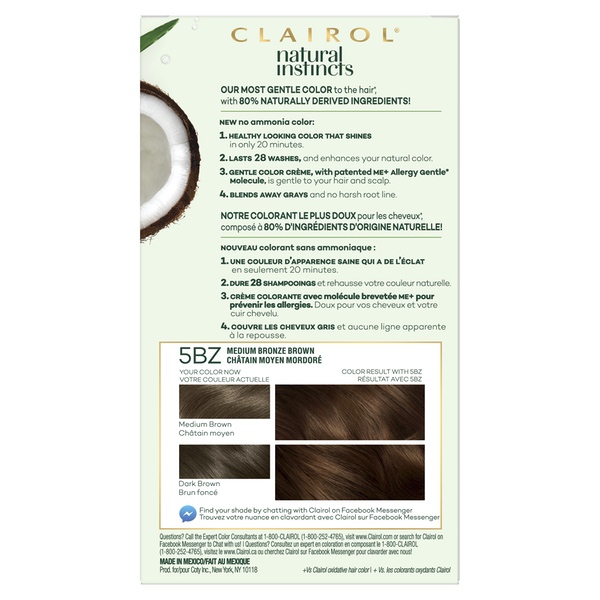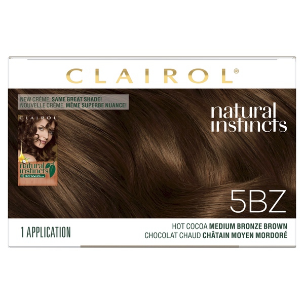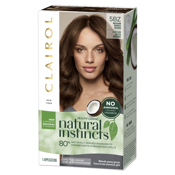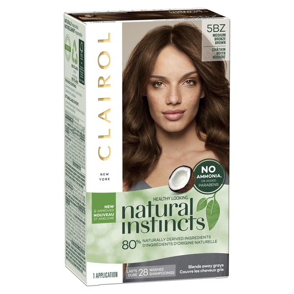 About This Item We aim to show you accurate product information. Manufacturers, suppliers and others provide what you see here, and we have not verified it. See our disclaimer Discover your natural way to shine! Made with 80% naturally derived ingredients, Clairol Natural Instincts gives you a rush of radiant, natural-looking color you can feel good about. Say "yes" to gentle ingredients like coconut oil and aloe vera and say "no" to ammonia and added parabens. Our no-drip crème formula is designed to feel more like a conditioner, and it's gentle on all hair types and textures. Treat yourself to color that blends away grays, boosts shine, and lasts up to 28 washes. Available in 37 natural shades, so you can find the black, brunette, blonde, or red hue that's totally you. Use the hair color chart below to find your ideal shade. Clairol Natural Instincts Hair Color, 5BZ Medium Bronze Brown