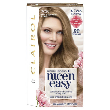 About This Item We aim to show you accurate product information. Manufacturers, suppliers and others provide what you see here, and we have not verified it. See our disclaimer Living is all about trying new experiences and feeling your best. So why waste time on bland, flat hair color? That's why Clairol Nice 'n Easy permanent hair color gives you 8 weeks of true-to-you color with three salon tones for a blend of highlights and lowlights. Expertly designed to work with your unique hair, Nice 'n Easy offers salon-quality permanent hair color without the cost. Keep your color looking vibrant with Clairol CC+ ColorSeal Conditioner, which locks in softness and shine. To cover grays between colorings, try Nice 'n Easy Root Touch-Up to blend seamlessly with your color. For natural-looking color that's as real as you are, trust Clairol Nice 'n Easy hair color. Clairol Nice 'n Easy Hair Color, 7C Dark Cool Blonde