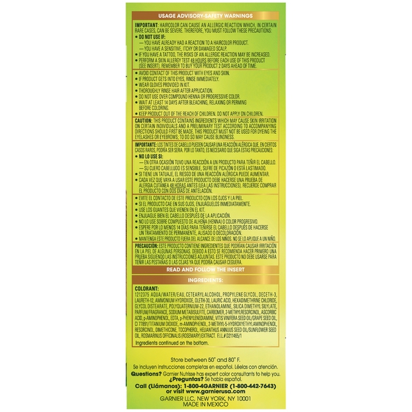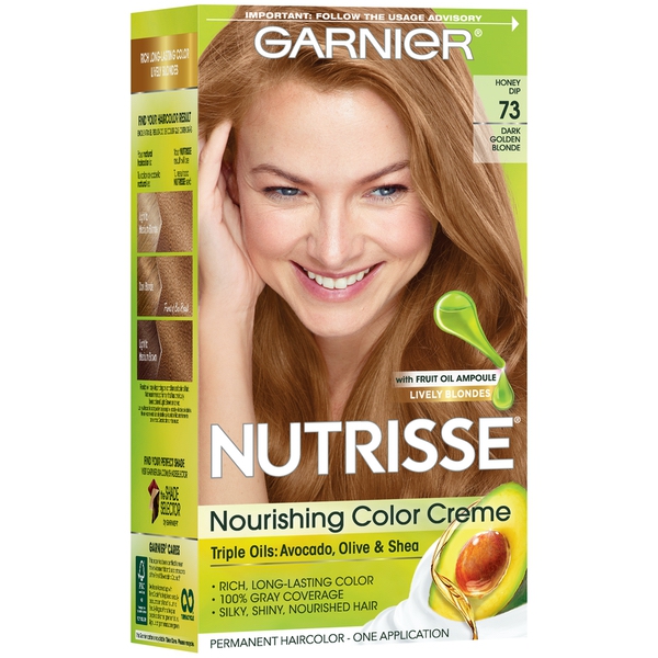 About This Item We aim to show you accurate product information. Manufacturers, suppliers and others provide what you see here, and we have not verified it. See our disclaimer Garnier® Nutrisse® Nourishing Hair Color Creme Garnier Nutrisse hair color creme nourishes while you color with avocado, olive, and shea oils. The nourishing color creme enriched with fruit oil concentrate, penetrates deep into hair fibers to nourish and condition your hair so it takes color better and holds it longer, root-to-tip. Garnier Nutrisse delivers rich, radiant, long-lasting hair color with 100% grey coverage. Permanent, nourishing hair color creme with three fruit oils- avocado, olive, and shea The only hair color creme with a separate ampoule of grape seed oil to start nourishing as you color Rich, radiant, long-lasting color with 100 percent grey coverage Available in 45 Nourishing Shades