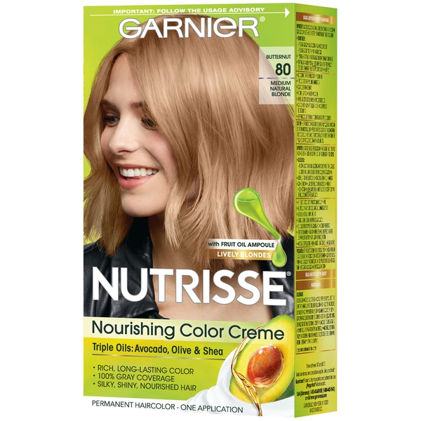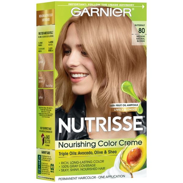 About This Item We aim to show you accurate product information. Manufacturers, suppliers and others provide what you see here, and we have not verified it. See our disclaimer Garnier® Nutrisse® Nourishing Hair Color Creme Garnier Nutrisse hair color creme nourishes while you color with avocado, olive, and shea oils. The nourishing color creme enriched with fruit oil concentrate, penetrates deep into hair fibers to nourish and condition your hair so it takes color better and holds it longer, root-to-tip. Garnier Nutrisse delivers rich, radiant, long-lasting hair color with 100% grey coverage. Permanent, nourishing hair color creme with three fruit oils- avocado, olive, and shea The only hair color creme with a separate ampoule of grape seed oil to start nourishing as you color Rich, radiant, long-lasting color with 100 percent grey coverage Available in 45 Nourishing Shades