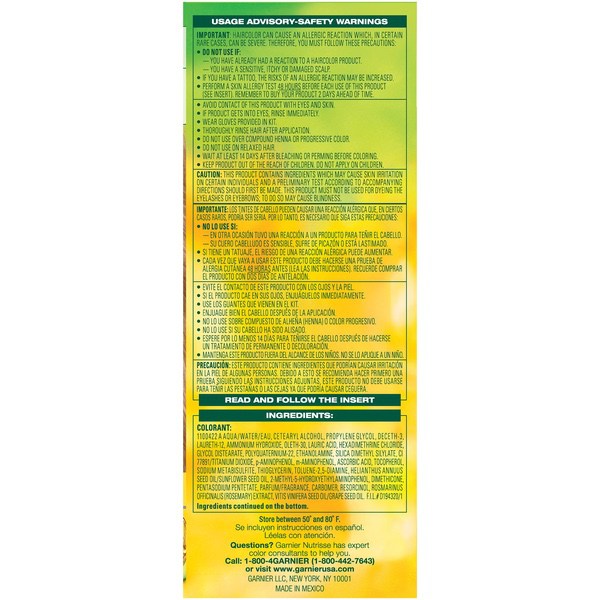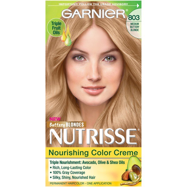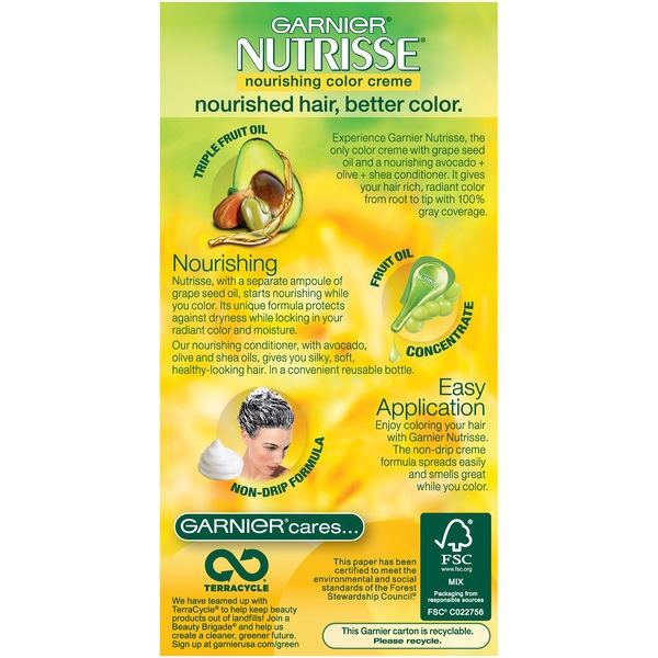 About This Item We aim to show you accurate product information. Manufacturers, suppliers and others provide what you see here, and we have not verified it. See our disclaimer Garnier® Nutrisse® Nourishing Hair Color Creme Garnier Nutrisse hair color creme nourishes while you color with avocado, olive, and shea oils. The nourishing color creme enriched with fruit oil concentrate, penetrates deep into hair fibers to nourish and condition your hair so it takes color better and holds it longer, root-to-tip. Garnier Nutrisse delivers rich, radiant, long-lasting hair color with 100% grey coverage. Permanent, nourishing hair color creme with three fruit oils- avocado, olive, and shea The only hair color creme with a separate ampoule of grape seed oil to start nourishing as you color Rich, radiant, long-lasting color with 100 percent grey coverage Available in 45 Nourishing Shades