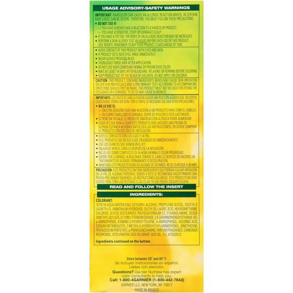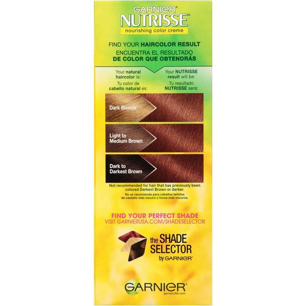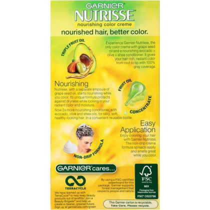 About This Item We aim to show you accurate product information. Manufacturers, suppliers and others provide what you see here, and we have not verified it. See our disclaimer Garnier® Nutrisse® Nourishing Hair Color Creme Garnier Nutrisse hair color creme nourishes while you color with avocado, olive, and shea oils. The nourishing color creme enriched with fruit oil concentrate, penetrates deep into hair fibers to nourish and condition your hair so it takes color better and holds it longer, root-to-tip. Garnier Nutrisse delivers rich, radiant, long-lasting hair color with 100% grey coverage. Permanent, nourishing hair color creme with three fruit oils- avocado, olive, and shea The only hair color creme with a separate ampoule of grape seed oil to start nourishing as you color Rich, radiant, long-lasting color with 100 percent grey coverage Available in 45 Nourishing Shades