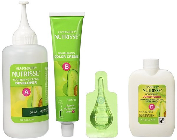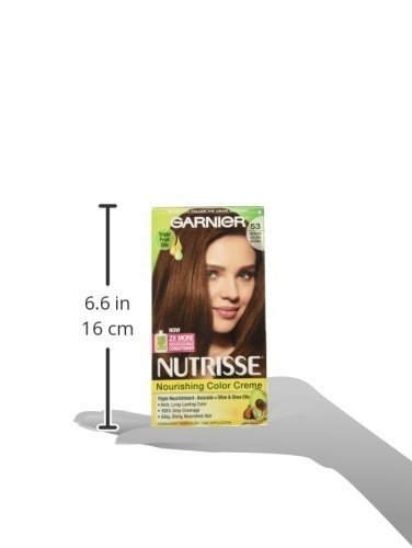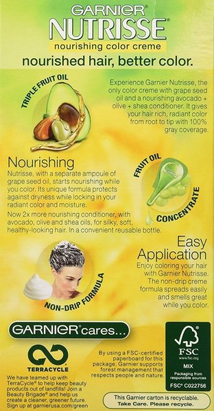 About This Item We aim to show you accurate product information. Manufacturers, suppliers and others provide what you see here, and we have not verified it. See our disclaimer Garnier Nutrisse Nourishing Hair Color Creme Garnier Nutrisse hair color creme nourishes while you color with avocado, olive, and shea oils. The nourishing color creme enriched with fruit oil concentrate, penetrates deep into hair fibers to nourish and condition your hair so it takes color better and holds it longer, root-to-tip. Garnier Nutrisse delivers rich, radiant, long-lasting hair color with 100% grey coverage. Permanent, nourishing hair color creme with three fruit oils- avocado, olive, and shea The only hair color creme with a separate ampoule of grape seed oil to start nourishing as you color Rich, radiant, long-lasting color with 100 percent grey coverage Available in 45 Nourishing Shades