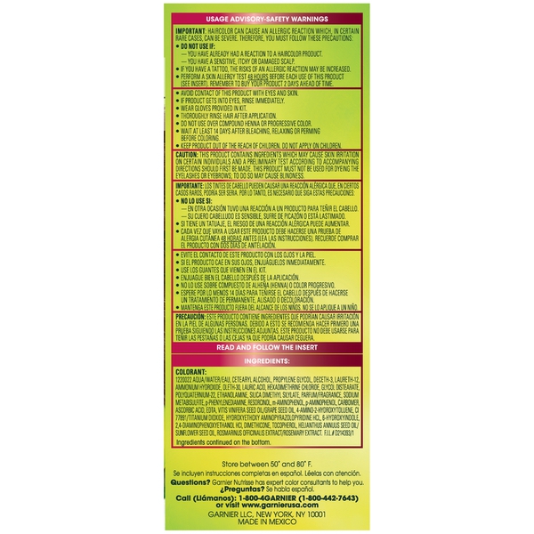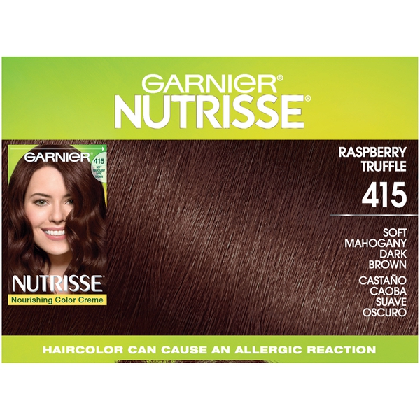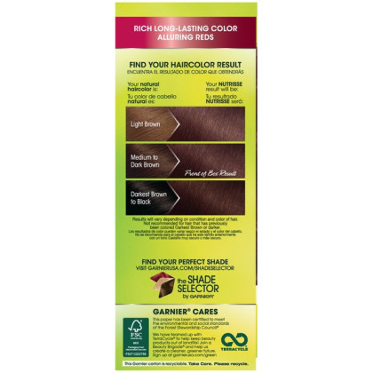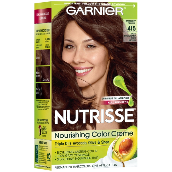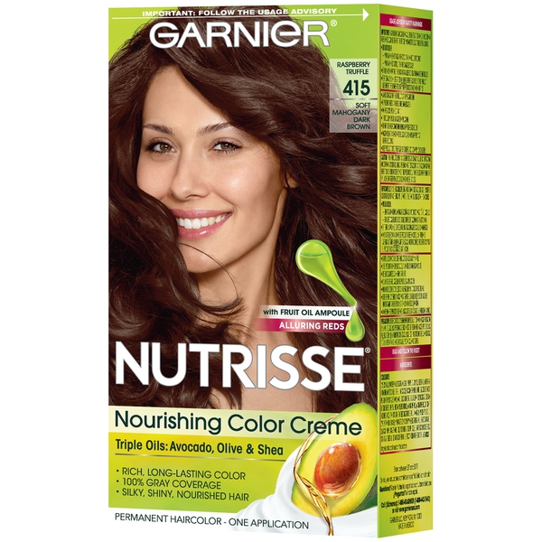 About This Item We aim to show you accurate product information. Manufacturers, suppliers and others provide what you see here, and we have not verified it. See our disclaimer Garnier Nutrisse Nourishing Hair Color Creme Garnier Nutrisse hair color creme nourishes while you color with avocado, olive, and shea oils. The nourishing color creme enriched with fruit oil concentrate, penetrates deep into hair fibers to nourish and condition your hair so it takes color better and holds it longer, root-to-tip. Garnier Nutrisse delivers rich, radiant, long-lasting hair color with 100% grey coverage. Permanent, nourishing hair color creme with three fruit oils- avocado, olive, and shea The only hair color creme with a separate ampoule of grape seed oil to start nourishing as you color Rich, radiant, long-lasting color with 100 percent grey coverage Available in 45 Nourishing Shades