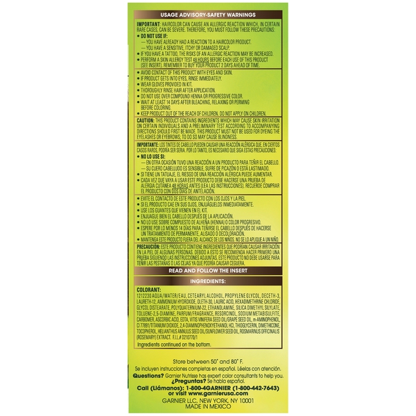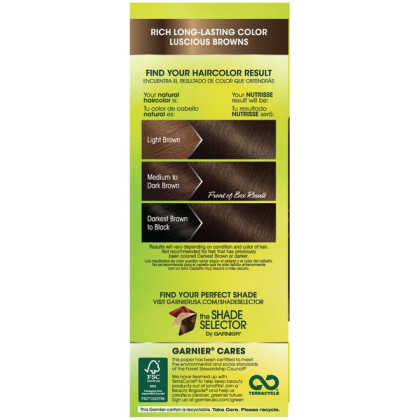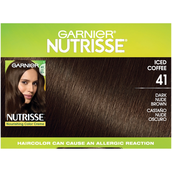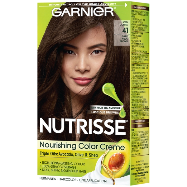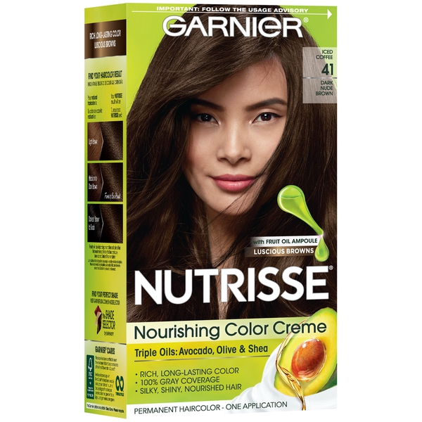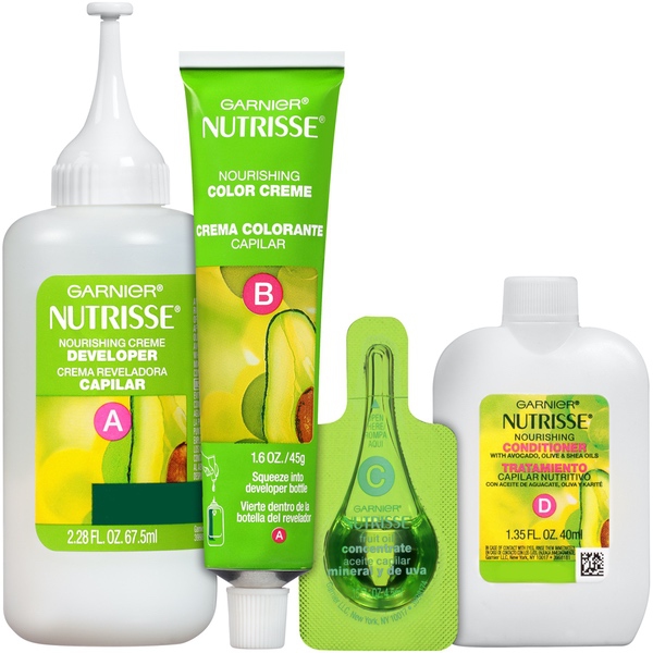 About This Item We aim to show you accurate product information. Manufacturers, suppliers and others provide what you see here, and we have not verified it. See our disclaimer Garnier Nutrisse Nourishing Hair Color Creme Garnier Nutrisse hair color creme nourishes while you color with avocado, olive, and shea oils. The nourishing color creme enriched with fruit oil concentrate, penetrates deep into hair fibers to nourish and condition your hair so it takes color better and holds it longer, root-to-tip. Garnier Nutrisse delivers rich, radiant, long-lasting hair color with 100% grey coverage. Permanent, nourishing hair color creme with three fruit oils- avocado, olive, and shea The only hair color creme with a separate ampoule of grape seed oil to start nourishing as you color Rich, radiant, long-lasting color with 100 percent grey coverage Available in 45 Nourishing Shades