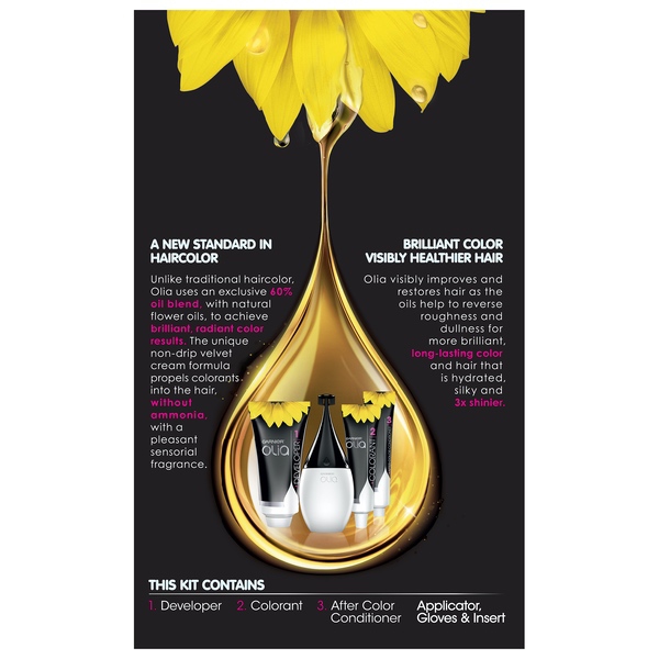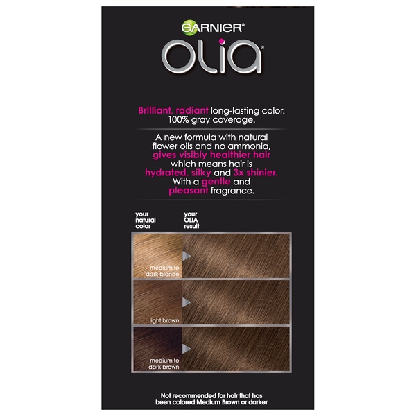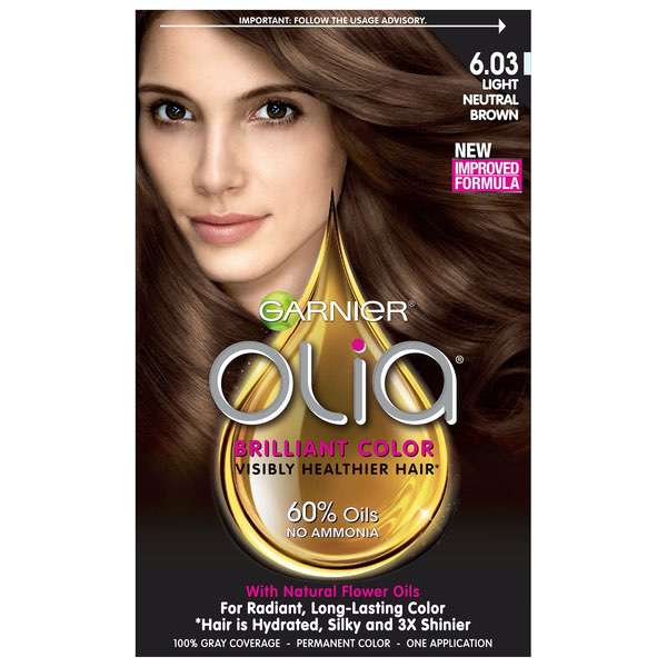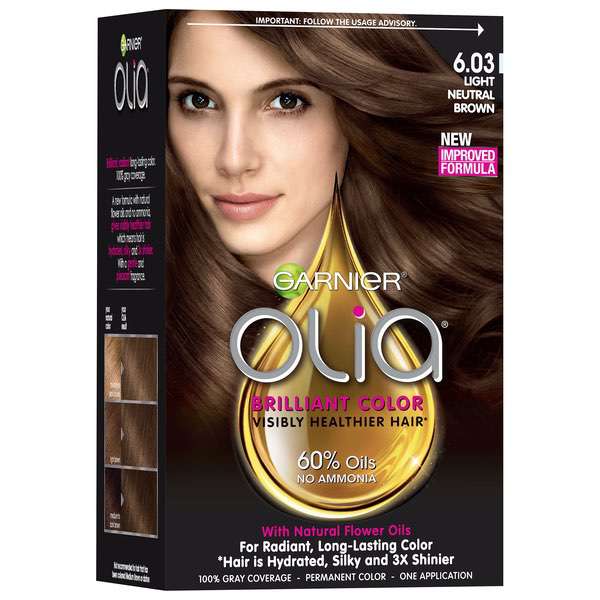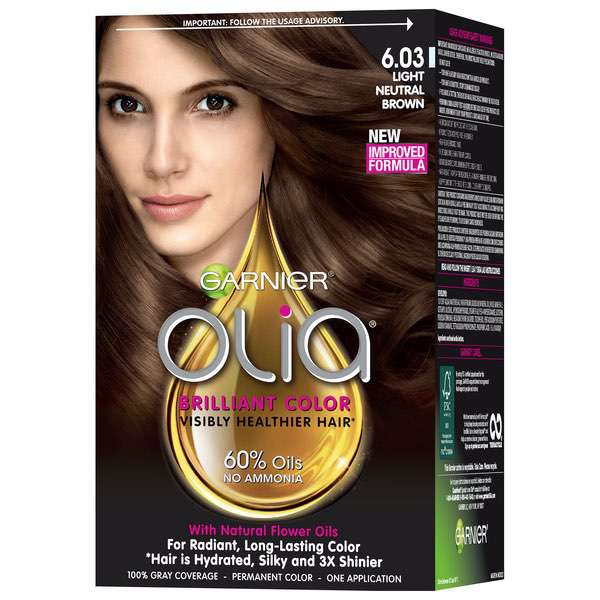 About This Item We aim to show you accurate product information. Manufacturers, suppliers and others provide what you see here, and we have not verified it. See our disclaimer Garnier Olia Oil Powered Permanent Hair Color Garnier Olia is unlike any other traditional, permanent hair color. Powered by a 60% oil blend formula with natural flower oils, Olia propels colorants deep into the hair, giving you vivid color results and 100% gray coverage. The non-drip formula has no ammonia, so it smells great as you apply, and the oils help to reverse roughness and dullness. The end result? More brilliant, long-lasting color and hair that is hydrated, silky, and up to 3x shinier than uncolored, unwashed hair. What's in the hair dye kit? A developer tube, a colorant tube, after color conditioner, as well as a set of gloves and the instruction sheet. Garnier Olia Oil Powered Permanent Color, 6.03 Light Neutral Brown 1 Kit Box Oil powered permanent color - 60% oil blend with natural flower oils and zero ammonia Brilliant color Visibly healthier hair Hair is hydrated, silky, and 3x shinier