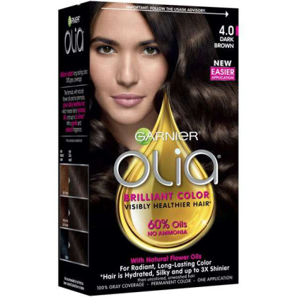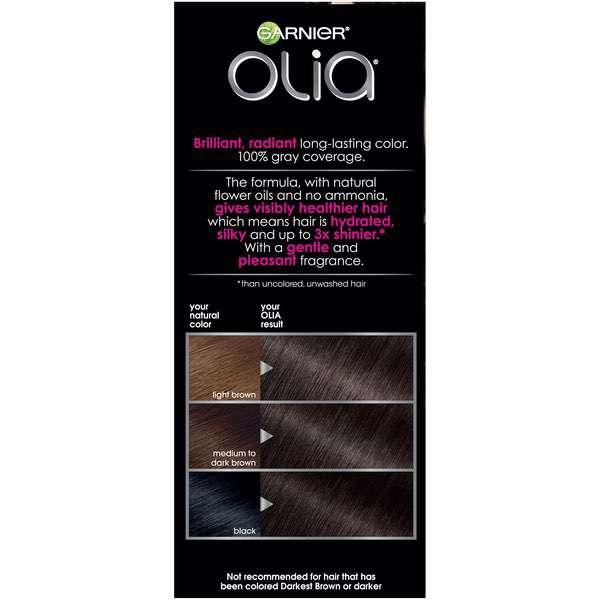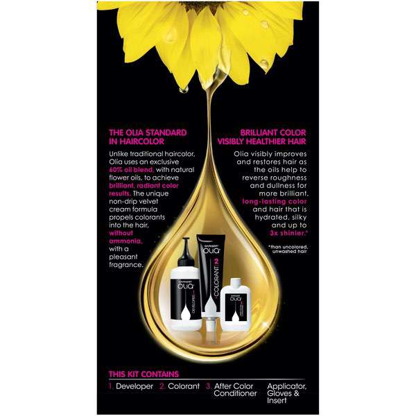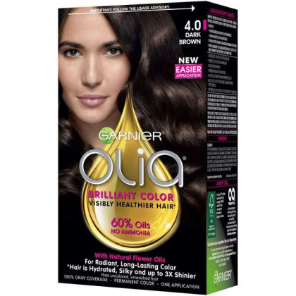 About This Item We aim to show you accurate product information. Manufacturers, suppliers and others provide what you see here, and we have not verified it. See our disclaimer Garnier Olia Oil Powered Permanent Hair Color Garnier Olia is unlike any other traditional, permanent hair color. Powered by a 60% oil blend formula with natural flower oils, Olia propels colorants deep into the hair, giving you vivid color results and 100% gray coverage. The non-drip formula has no ammonia, so it smells great as you apply, and the oils help to reverse roughness and dullness. The end result? More brilliant, long-lasting color and hair that is hydrated, silky, and up to 3x shinier than uncolored, unwashed hair. What's in the hair dye kit? A developer tube, a colorant tube, after color conditioner, as well as a set of gloves and the instruction sheet. Garnier Olia Oil Powered Permanent Color, 6.03 Light Neutral Brown 1 Kit Box Oil powered permanent color - 60% oil blend with natural flower oils and zero ammonia Brilliant color Visibly healthier hair Hair is hydrated, silky, and 3x shinier