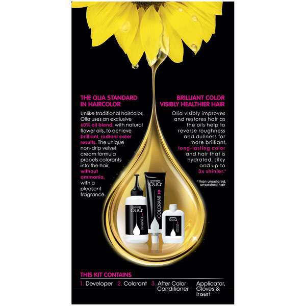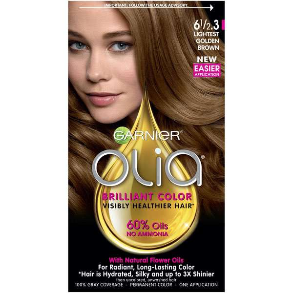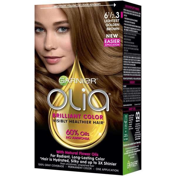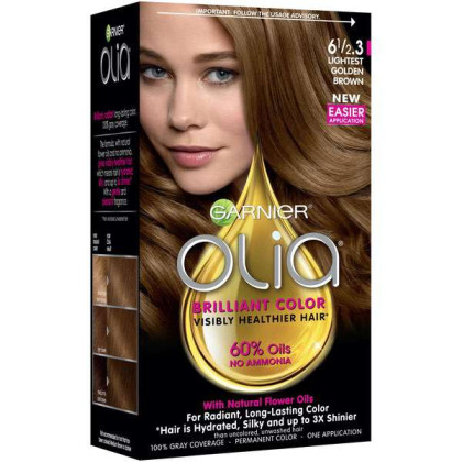 About This Item We aim to show you accurate product information. Manufacturers, suppliers and others provide what you see here, and we have not verified it. See our disclaimer Garnier Olia Oil Powered Permanent Hair Color Garnier Olia is unlike any other traditional, permanent hair color. Powered by a 60% oil blend formula with natural flower oils, Olia propels colorants deep into the hair, giving you vivid color results and 100% gray coverage. The non-drip formula has no ammonia, so it smells great as you apply, and the oils help to reverse roughness and dullness. The end result? More brilliant, long-lasting color and hair that is hydrated, silky, and up to 3x shinier than uncolored, unwashed hair. What's in the hair dye kit? A developer tube, a colorant tube, after color conditioner, as well as a set of gloves and the instruction sheet. Garnier Olia Oil Powered Permanent Color, 6.03 Light Neutral Brown 1 Kit Box Oil powered permanent color - 60% oil blend with natural flower oils and zero ammonia Brilliant color Visibly healthier hair Hair is hydrated, silky, and 3x shinier