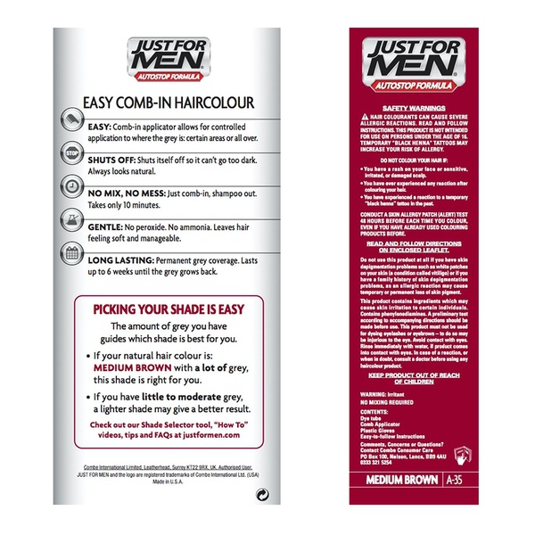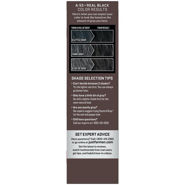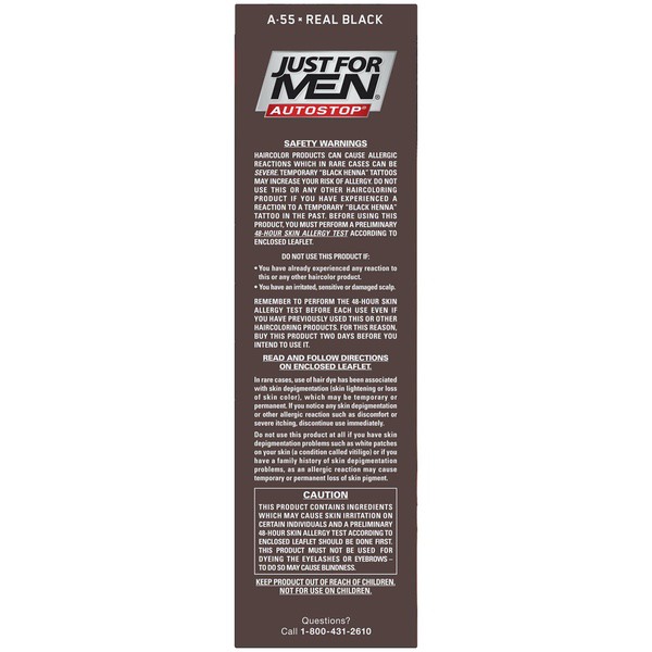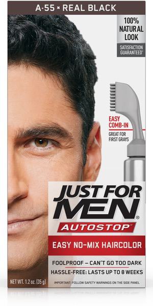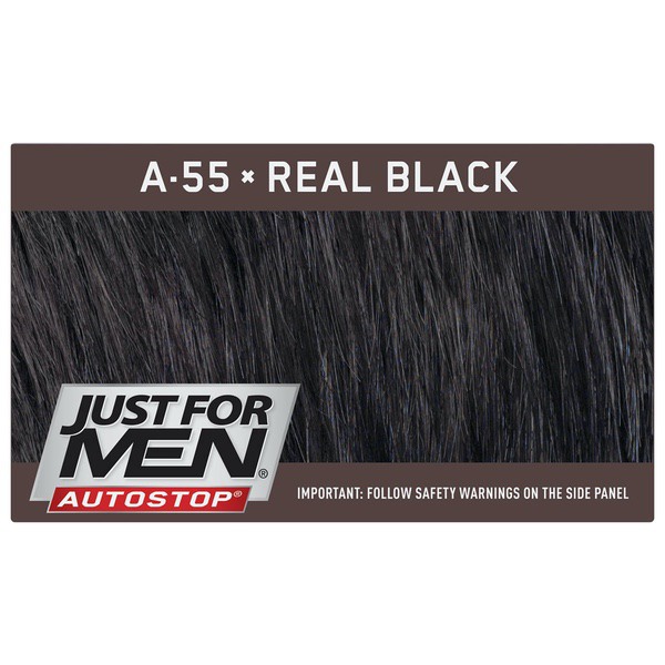 About This Item We aim to show you accurate product information. Manufacturers, suppliers and others provide what you see here, and we have not verified it. See our disclaimer For guys who want a foolproof way to get rid of gray hair color for natural looking results, there's Just For Men AutoStop. This easy comb-in, no mix, no mess formula only takes ten minutes to color every single gray hair, and lasts until the gray hair grows back. Just For Men AutoStop comes in many natural looking shades, so it's easy to find the one that truly matches your natural hair color. Can't decide between two shades? Try the lighter one first. You can always go darker later. Just For Men AutoStop Real Black Easy Comb-in, No-Mix Men's Hair Color Gets rid of gray hair. And it is foolproof, because it can't go too dark This men’s hair dye formula contains no peroxide and no ammonia, gently changing hair color Lasts for up to 8 weeks, or until your grey hair grows back