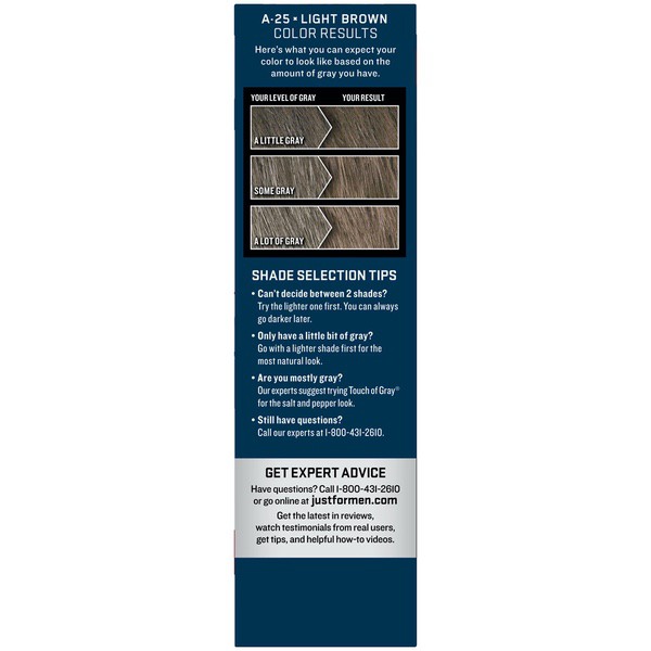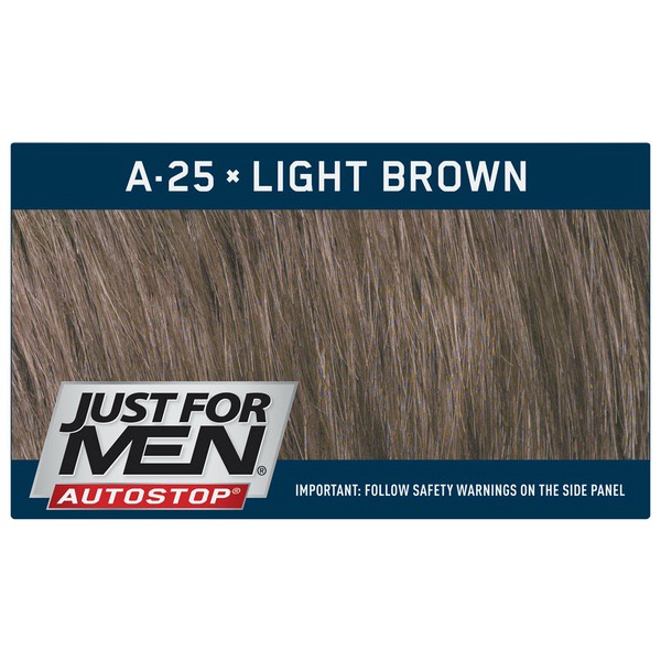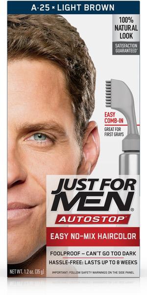 About This Item We aim to show you accurate product information. Manufacturers, suppliers and others provide what you see here, and we have not verified it. See our disclaimer For guys who want a foolproof way to get rid of gray hair color for natural looking results, there's Just For Men AutoStop. This easy comb-in, no mix, no mess formula only takes ten minutes to color every single gray hair, and lasts until the gray hair grows back. Just For Men AutoStop comes in many natural looking shades, so it's easy to find the one that truly matches your natural hair color. Can't decide between two shades? Try the lighter one first. You can always go darker later. Just For Men AutoStop Real Black Easy Comb-in, No-Mix Men's Hair Color Gets rid of gray hair. And it is foolproof, because it can't go too dark This men’s hair dye formula contains no peroxide and no ammonia, gently changing hair color Lasts for up to 8 weeks, or until your grey hair grows back