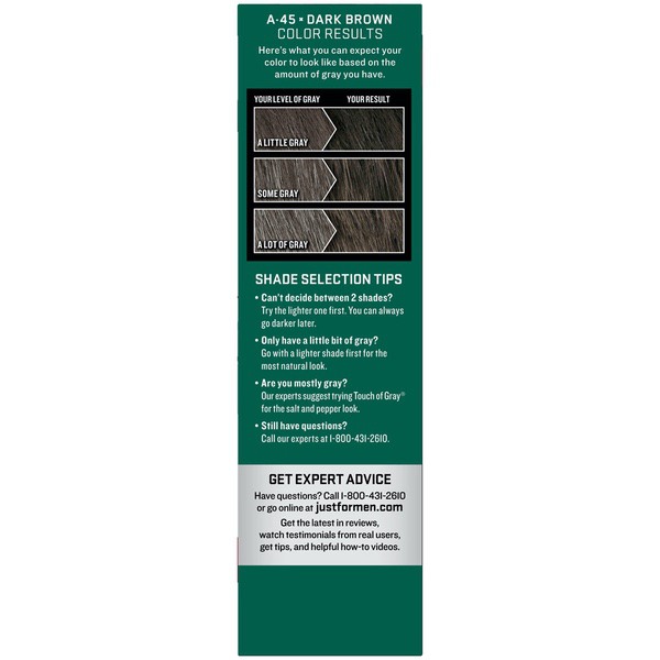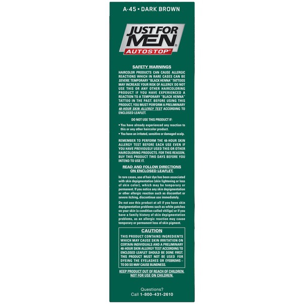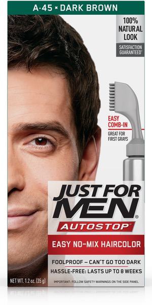 About This Item We aim to show you accurate product information. Manufacturers, suppliers and others provide what you see here, and we have not verified it. See our disclaimer For guys who want a foolproof way to get rid of gray hair color for natural looking results, there's Just For Men AutoStop. This easy comb-in, no mix, no mess formula only takes ten minutes to color every single gray hair, and lasts until the gray hair grows back. Just For Men AutoStop comes in many natural looking shades, so it's easy to find the one that truly matches your natural hair color. Can't decide between two shades? Try the lighter one first. You can always go darker later. Just For Men AutoStop Real Black Easy Comb-in, No-Mix Men's Hair Color Gets rid of gray hair. And it is foolproof, because it can't go too dark This men’s hair dye formula contains no peroxide and no ammonia, gently changing hair color Lasts for up to 8 weeks, or until your grey hair grows back
