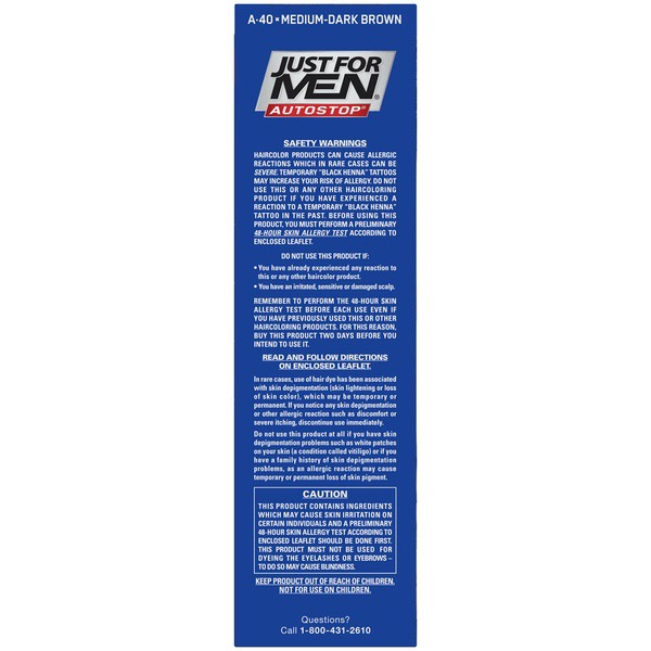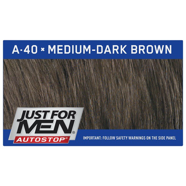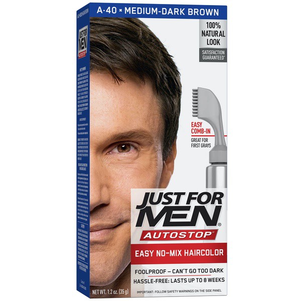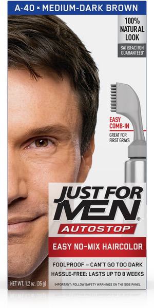 About This Item We aim to show you accurate product information. Manufacturers, suppliers and others provide what you see here, and we have not verified it. See our disclaimer For guys who want a foolproof way to get rid of gray hair color for natural looking results, there's Just For Men AutoStop. This easy comb-in, no mix, no mess formula only takes ten minutes to color every single gray hair, and lasts until the gray hair grows back. Just For Men AutoStop comes in many natural looking shades, so it's easy to find the one that truly matches your natural hair color. Can't decide between two shades? Try the lighter one first. You can always go darker later. Just For Men AutoStop Real Black Easy Comb-in, No-Mix Men's Hair Color Gets rid of gray hair. And it is foolproof, because it can't go too dark This men’s hair dye formula contains no peroxide and no ammonia, gently changing hair color Lasts for up to 8 weeks, or until your grey hair grows back