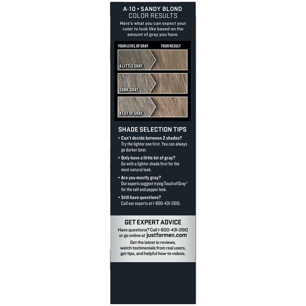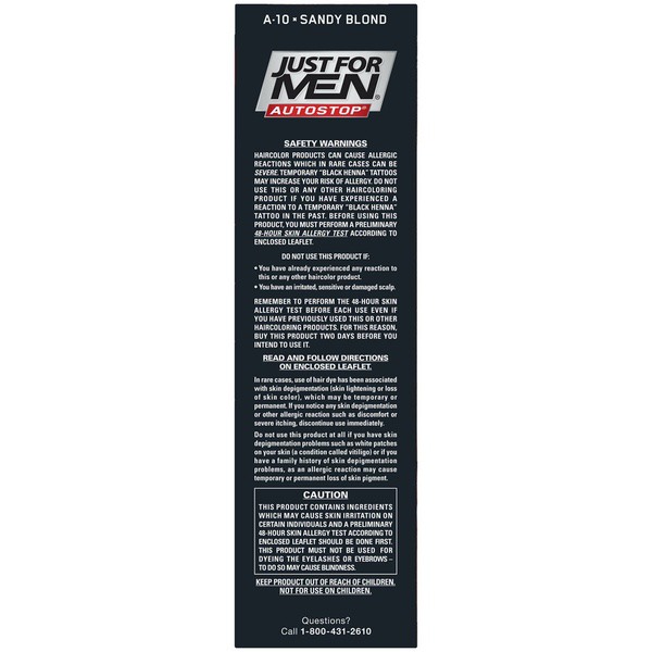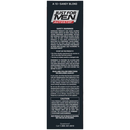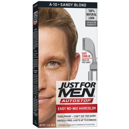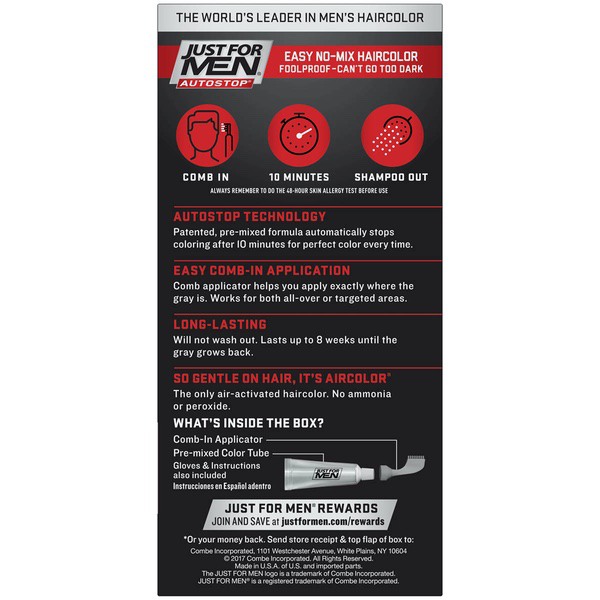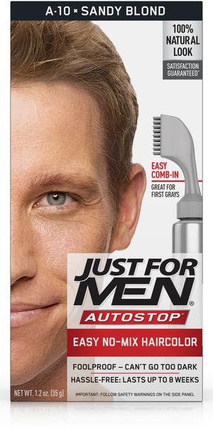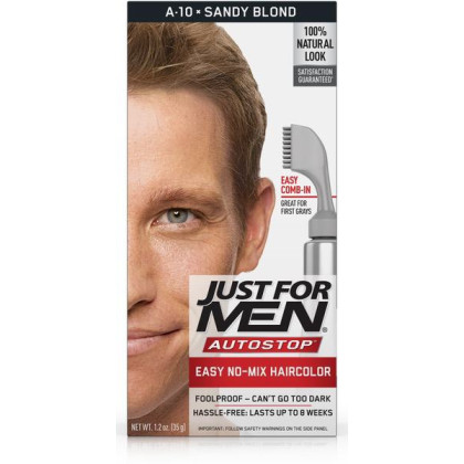 About This Item We aim to show you accurate product information. Manufacturers, suppliers and others provide what you see here, and we have not verified it. See our disclaimer For guys who want a foolproof way to get rid of gray hair color for natural looking results, there's Just For Men AutoStop. This easy comb-in, no mix, no mess formula only takes ten minutes to color every single gray hair, and lasts until the gray hair grows back. Just For Men AutoStop comes in many natural looking shades, so it's easy to find the one that truly matches your natural hair color. Can't decide between two shades? Try the lighter one first. You can always go darker later. Just For Men AutoStop Real Black Easy Comb-in, No-Mix Men's Hair Color Gets rid of gray hair. And it is foolproof, because it can't go too dark This men’s hair dye formula contains no peroxide and no ammonia, gently changing hair color Lasts for up to 8 weeks, or until your grey hair grows back