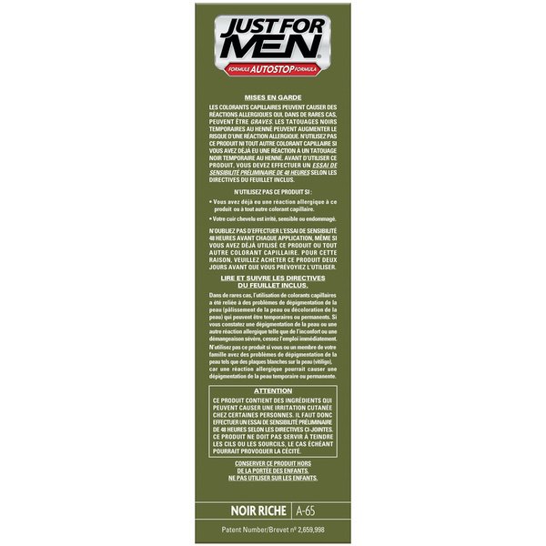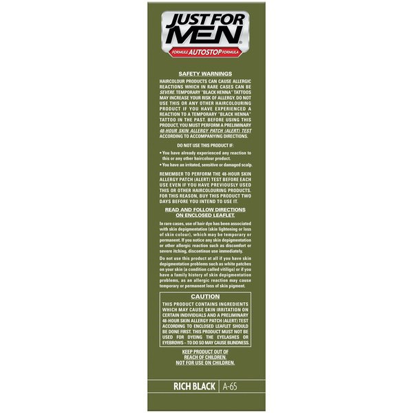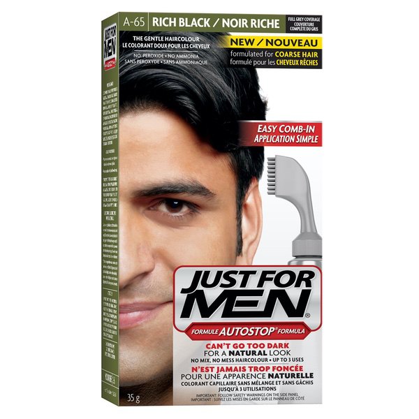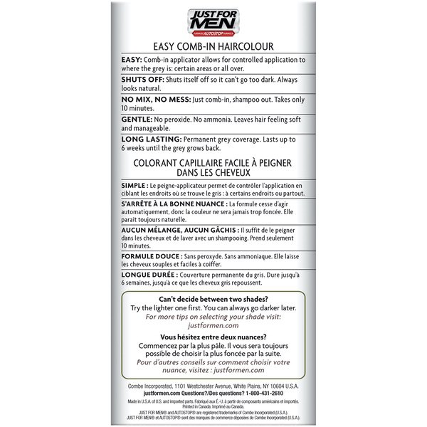 About This Item We aim to show you accurate product information. Manufacturers, suppliers and others provide what you see here, and we have not verified it. See our disclaimer For guys who want a foolproof way to get rid of gray hair color for natural looking results, there's Just For Men AutoStop. This easy comb-in, no mix, no mess formula only takes ten minutes to color every single gray hair, and lasts until the gray hair grows back. Just For Men AutoStop comes in many natural looking shades, so it's easy to find the one that truly matches your natural hair color. Can't decide between two shades? Try the lighter one first. You can always go darker later. Just For Men AutoStop Real Black Easy Comb-in, No-Mix Men's Hair Color Gets rid of gray hair. And it is foolproof, because it can't go too dark This men’s hair dye formula contains no peroxide and no ammonia, gently changing hair color Lasts for up to 8 weeks, or until your grey hair grows back