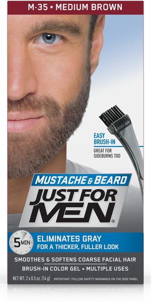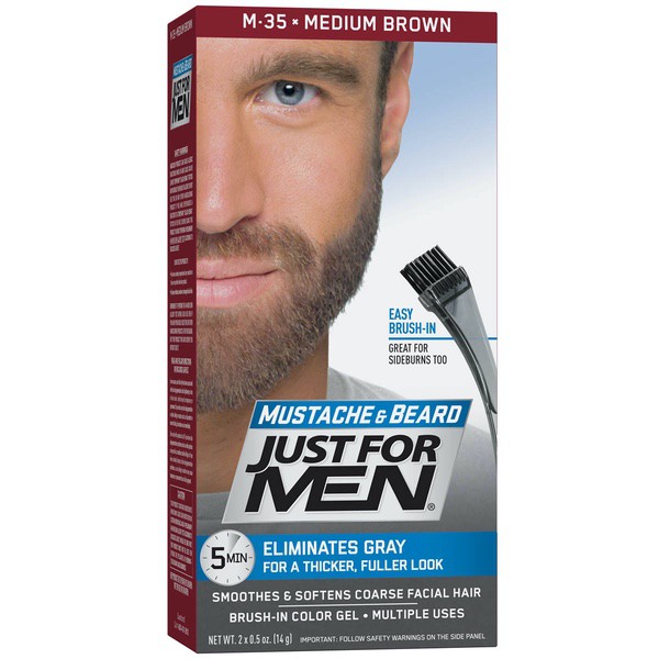 About This Item We aim to show you accurate product information. Manufacturers, suppliers and others provide what you see here, and we have not verified it. See our disclaimer Just For Men Mustache & Beard hair color brings out the best in your facial hair. Facial hair looks fuller, more even and well-groomed as you get rid of the scraggly look of gray facial hairs. The fast and easy brush-in gel works in 5 minutes - your gray hair will be gone until it grows back. This ammonia-free formula is made specifically to penetrate and condition coarse facial hair. Just For Men Mustache and Beard hair color contains protein, Vitamin E, aloe and chamomile that nourishes your hair while you color. It leaves your facial hair looking well groomed, conditioned and thicker after every application. Its ammonia free formula causes no damage to your hair. Can't decide between two shades? Try the lighter one first. You can always go darker later. Just For Men Mustache & Beard, Darkest Brown Eliminates gray hairs for a thicker, fuller look Works in 5 easy minutes Easy Brush-In Application Just For Men Beard & Mustache is specially formulated to penetrate coarse facial hair