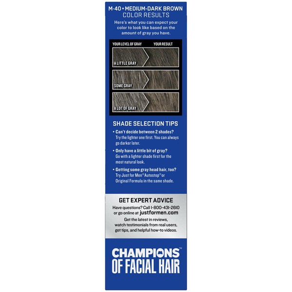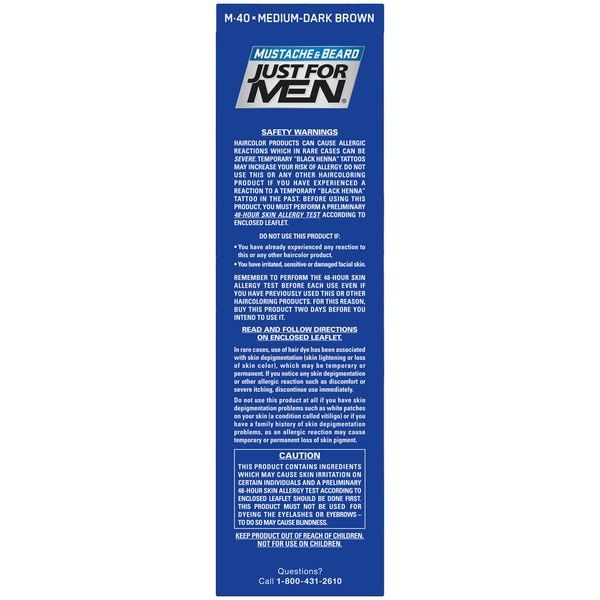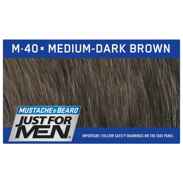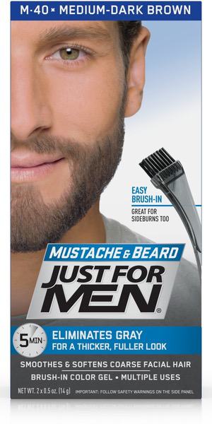 About This Item We aim to show you accurate product information. Manufacturers, suppliers and others provide what you see here, and we have not verified it. See our disclaimer Just For Men Mustache & Beard hair color brings out the best in your facial hair. Facial hair looks fuller, more even and well-groomed as you get rid of the scraggly look of gray facial hairs. The fast and easy brush-in gel works in 5 minutes - your gray hair will be gone until it grows back. This ammonia-free formula is made specifically to penetrate and condition coarse facial hair. Just For Men Mustache and Beard hair color contains protein, Vitamin E, aloe and chamomile that nourishes your hair while you color. It leaves your facial hair looking well groomed, conditioned and thicker after every application. Its ammonia free formula causes no damage to your hair. Can't decide between two shades? Try the lighter one first. You can always go darker later. Just For Men Mustache & Beard, Darkest Brown Eliminates gray hairs for a thicker, fuller look Works in 5 easy minutes Easy Brush-In Application Just For Men Beard & Mustache is specially formulated to penetrate coarse facial hair