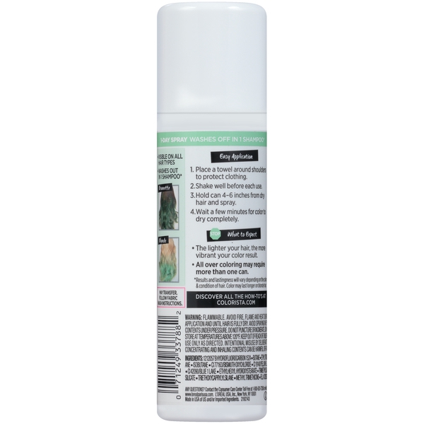 About This Item We aim to show you accurate product information. Manufacturers, suppliers and others provide what you see here, and we have not verified it. See our disclaimer L'Oreal Paris Colorista 1-Day Spray L'Oreal Paris Colorista Spray lets you play with color in a whole new way! A temporary hair color spray that allows you to instantly get bold looks when you want them and how you want them without the commitment - this color spray for hair is out after 1 day and is kind to your hair. Just spray, play, wash, repeat. Each shade is formulated to allow for vivid color on all hair types, no bleach required. Break with the routine and start exploring your style with Colorista Sprays! For all hair types and colors Temporary hair color with pure pigments Quick spray application No Bleach required