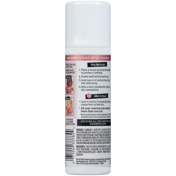 About This Item We aim to show you accurate product information. Manufacturers, suppliers and others provide what you see here, and we have not verified it. See our disclaimer L'Oreal Paris Colorista 1-Day Spray L'Oreal Paris Colorista Spray lets you play with color in a whole new way! A temporary hair color spray that allows you to instantly get bold looks when you want them and how you want them without the commitment - this color spray for hair is out after 1 day and is kind to your hair. Just spray, play, wash, repeat. Each shade is formulated to allow for vivid color on all hair types, no bleach required. Break with the routine and start exploring your style with Colorista Sprays! For all hair types and colors Temporary hair color with pure pigments Quick spray application No Bleach required