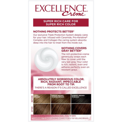 About This Item We aim to show you accurate product information. Manufacturers, suppliers and others provide what you see here, and we have not verified it. See our disclaimer There's a reason it's called Excellence. Nothing protects or covers grays better*. L'Oreal Excellence Cr?me's Exclusive Triple Protection System seals, replenishes and conditions your hair for up to 8 weeks of protection. All that, and 100% gray hair coverage, even on stubborn grays.*compared to each leading competitor's top selling brand. Super Rich Care Super Rich Color 100 Percent Long-Lasting Gray Coverage