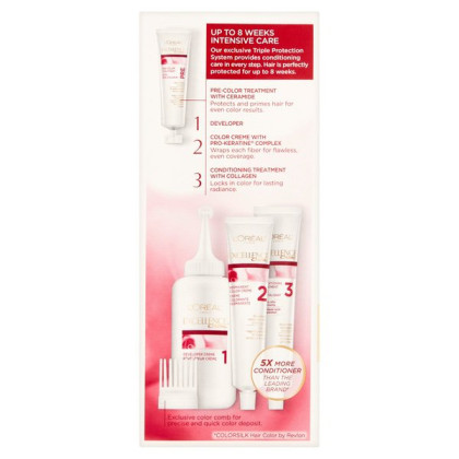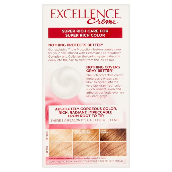 About This Item We aim to show you accurate product information. Manufacturers, suppliers and others provide what you see here, and we have not verified it. See our disclaimer Get a salon-quality finish in the comfort of your home with the L'Oreal Paris Excellence Creme Hair Color. Discover excellence creme lights. The gentle, non-drip formula lets you create creamy, beautifully blended highlights in a few simple steps. This permanent hair color delivers triple protection permanent hair color that revitalizes and protects hair from the inside and out. The results—rich, radiant highlights and not a gray in sight. It also offers longer-lasting gray coverage compared to the leading competitor's brand. The beige blond hair color is also available in other shades, so you can find one that suits your preference. L'Oreal Paris Excellence Creme Hair Color, 8BB Medium Beige Blonde, 1 Kit: Permanent hair col0r comes in 01 Extra Light Ash Blonde, 02 Extra Light Natural Blonde, 1 Black, 1BB Velvet Black, 1C Cool Black, 1N Rich Black, 2.0 Soft Black, 2B Intense Blue Black, 2C Luscious Black, 3 Natural Black and many more shades 1 application per package Features ceramides, plus Pro-Keratine and collagen to bind to the strands Delivers 100% coverage of gray hair Lasts for up to 8 weeks